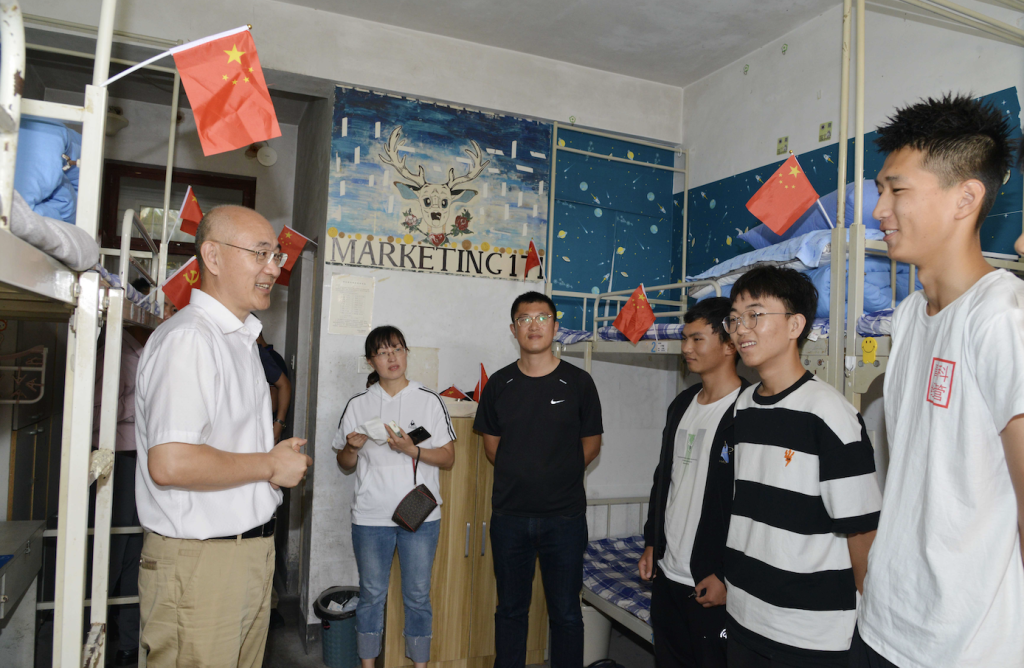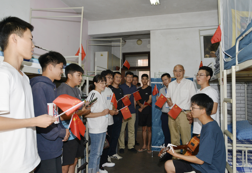 青岛科技大学校长陈克正受邀参加了新生宿舍的主题团日活动,在崂山校区南5号楼105宿舍,同学们弹奏起吉他,和陈克正校长及其他部门老师共同歌唱《我和我的祖国》;在107宿舍,大家共同观看了央视《中国梦·祖国颂—2021国庆特别节目》,铭记红色历史,赓续红色血脉。陈克正详细了解了秋季学期开学以来同学们在校的学习、生活情况,肯定了同学们积极加入体育协会,在体育锻炼中享受乐趣、增强体质、健全人格、锤炼意志,他嘱咐同学们要厚植爱国情、砥砺强国志。陈克正表示,“要培养德智体美劳全面发展的社会主义建设者和接班人,就要始终牢记为党育人,为国育才的初心使命,切实把同学们的日常生活丰富起来,积极推动体育改革进程,引领青年学子立大志、明大德、成大才、担大任,深入践行‘请党放心、强国有我’的铿锵誓言,为实现中华民族伟大复兴作出科大学子应有的贡献。”