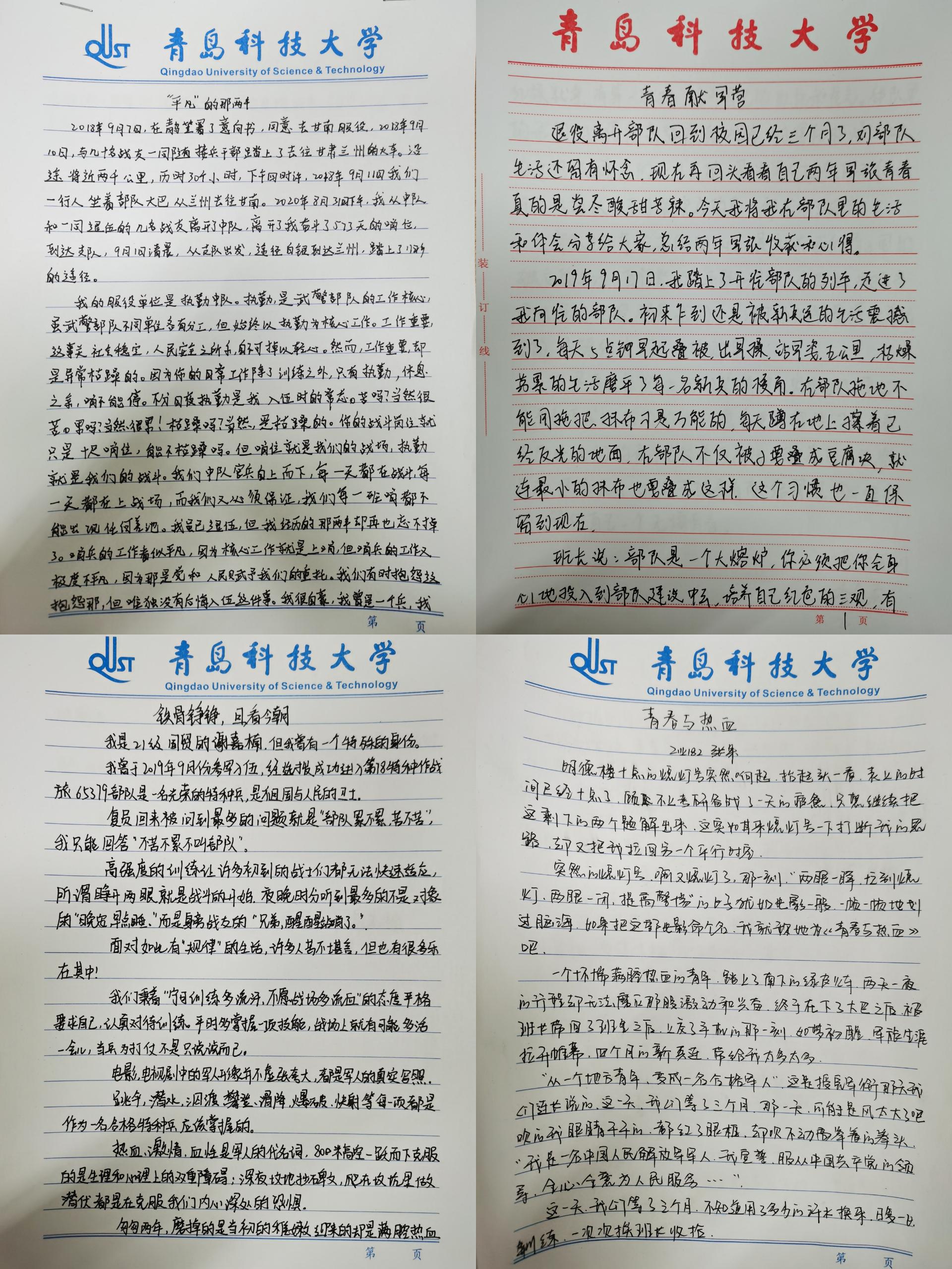 同时,几位同学和2021年参军入伍的同学还以书面的形式,通过笔端将自己在军营的感受,以及想要对同学们说的话书写下来,以此鼓舞大家学好文化知识,青春建功军营的热血豪情。
