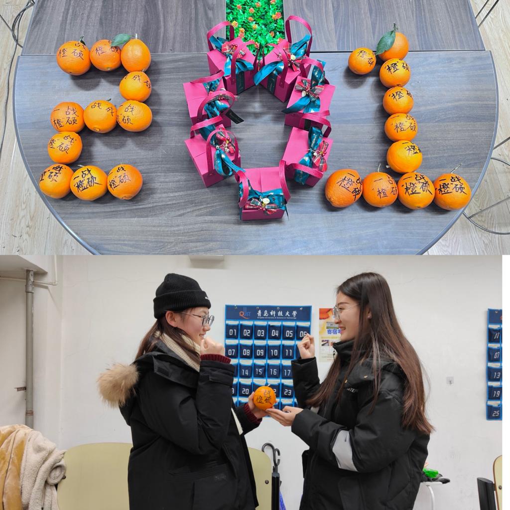 辅导员为考研的学生挑选了具有马到“橙”功、“苹”安顺利美好寓意的橙子和苹果,将祝福放入吉祥如意的红色纸袋中组成一个个凝结韦德国际