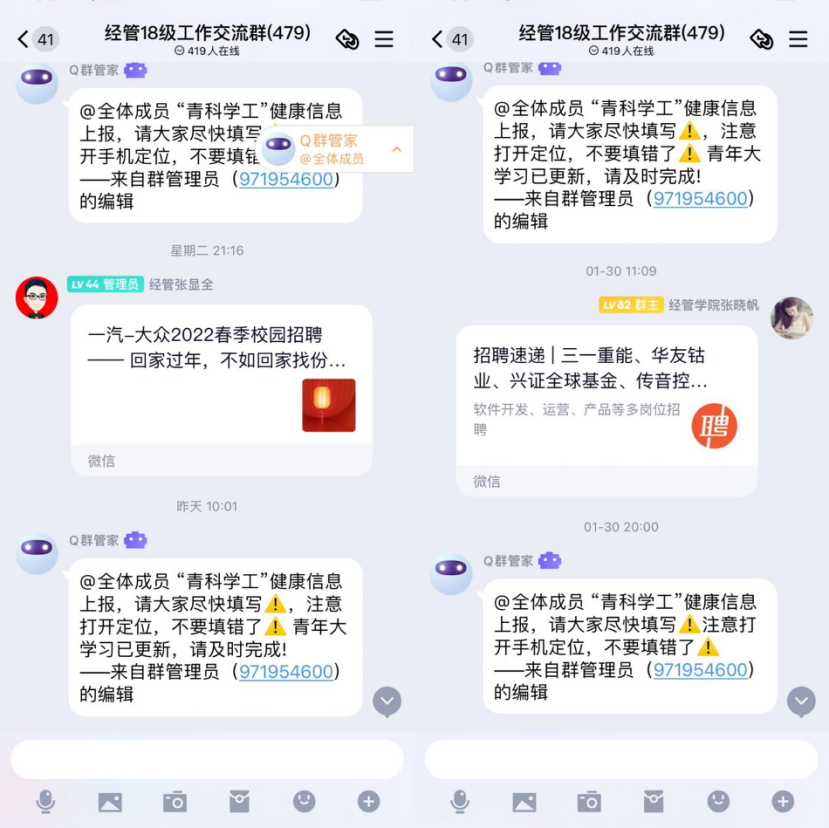 2022年正值北京冬奥会开幕,2018级辅导员将奥运与育人相结合,教育引导青年学生坚定理想信念,厚植家国情怀。同时结合学校体育改革,指导广大学生寒假期间进行科学合理的体育锻炼。在疫情防控常态化背景下,引导学生做好自身防护,保证学生每天按时上报,确保广大学生度过一个安全祥和稳定的春节。