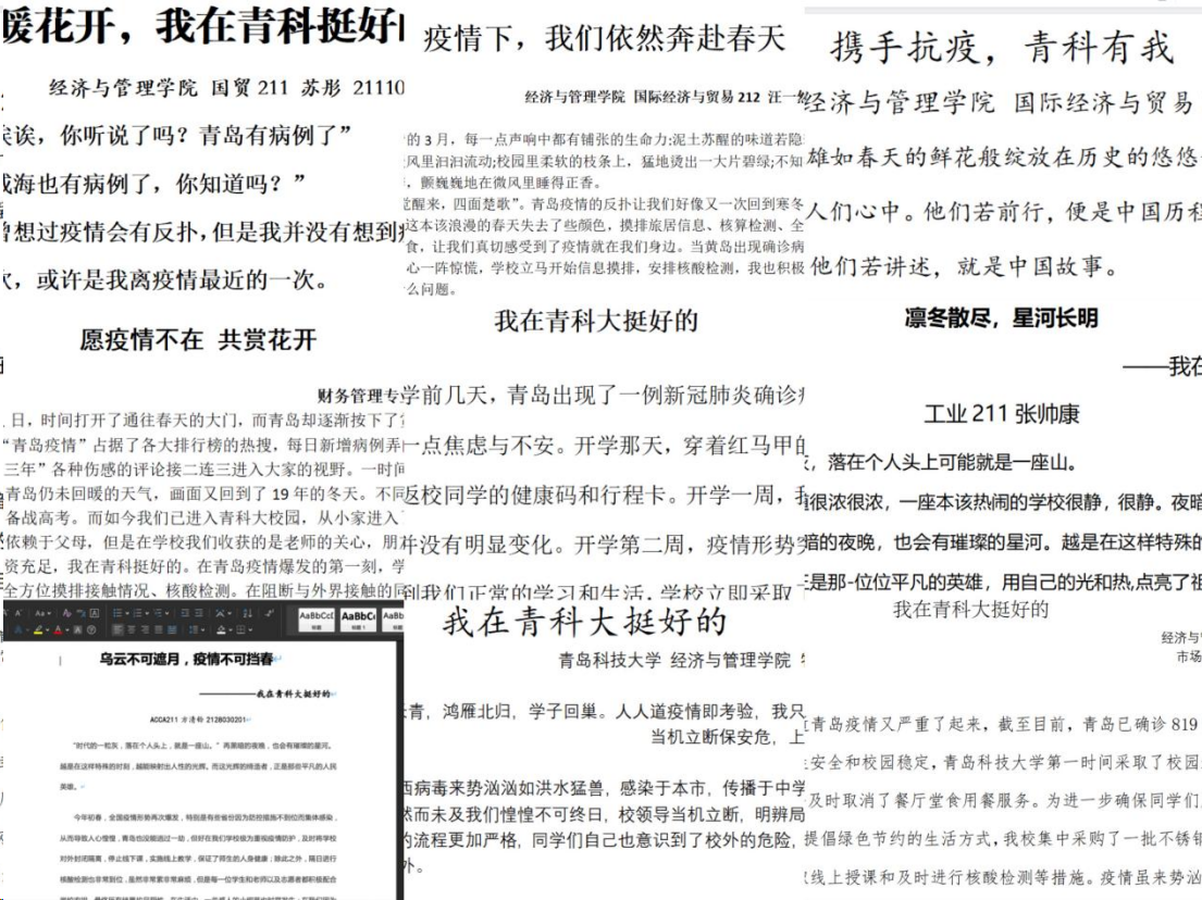 全面贯彻落实上级部门和学校关于疫情防控工作的具体要求,全方位上好疫情防控“大思政课”。面向全体学生征集“我在青科大挺好的”主题征文,鼓励同学们用温暖的文字表达对战“疫”必胜的信心、关于疫情的深度思考以及同学们通过此次疫情大考获得的成长与进步,引导同学们积极关注自我,增强心理免疫力,进一步提高同学们的心理防疫能力和自我调适能力。广泛开展“用‘心’战‘疫’”线上主题班会,加强权威信息推介和宣传引导,减少焦虑恐慌情绪,引导学生及时调整负面情绪,相互关爱支持,凝心聚力打赢疫情防卫战。