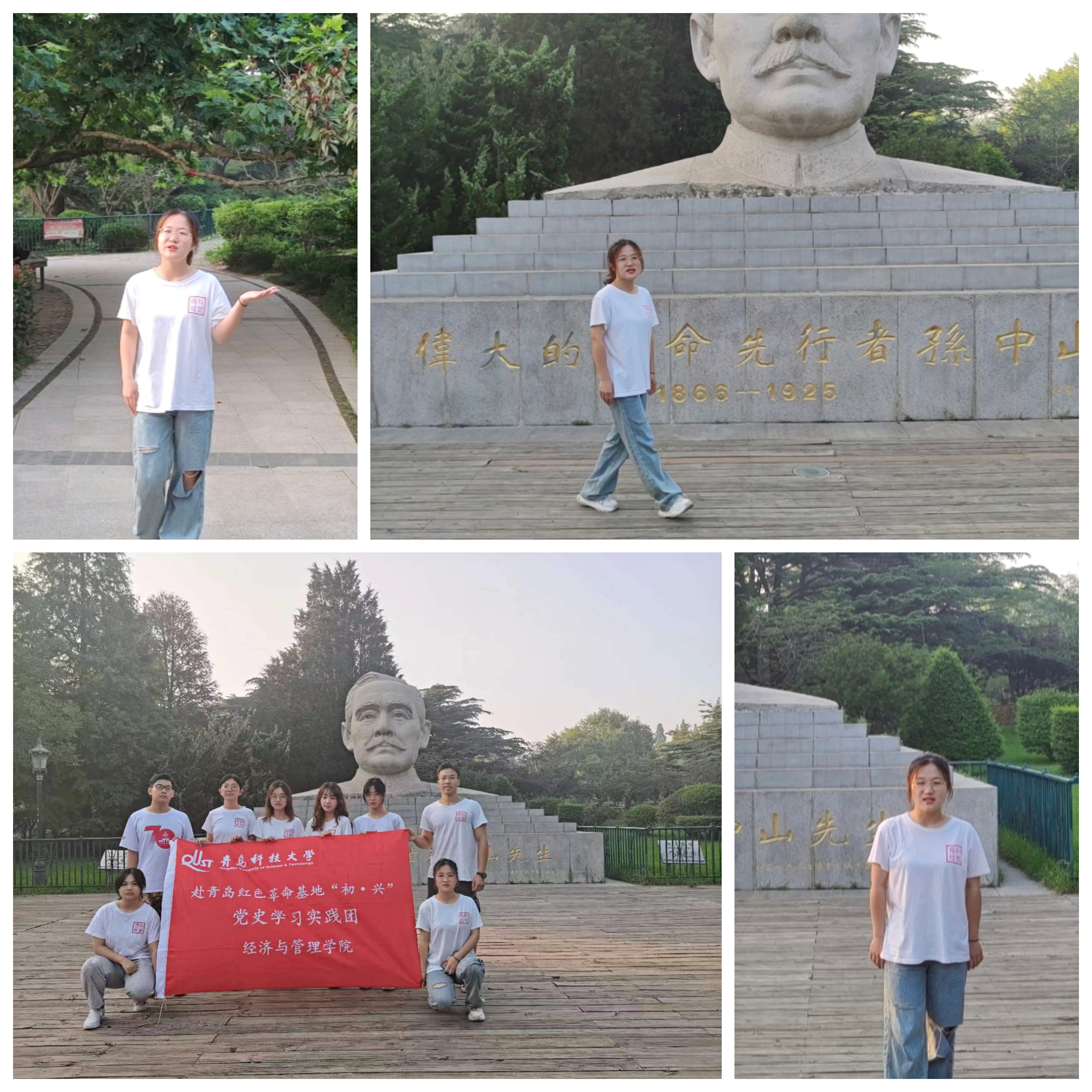 中山公园是青岛的一座综合性公园,由德国殖民者始建。1922年我国收回青岛主权后,改名为“第一公园“。整装待发后,成员们共同游览了中山公园,并重点瞻仰了孙中山先生的雕像。在宣讲员黄文菡同学的讲解下,团队成员回顾了孙中山先生一生为革命事业作出的贡献和中国共产党的光辉历程,了解了公园的建园历史和与之相随的中国艰苦革命历程,同时也吸引了不少市民与游客的关注。其中有一位农民导演在宣讲结束后留下与团队进行了交流,“我带领农民拍了一辈子戏,很多也是革命题材的,你们做的这个事情有意义啊,一定不能只当做是学校的任务来做,要坚持的做下去!“