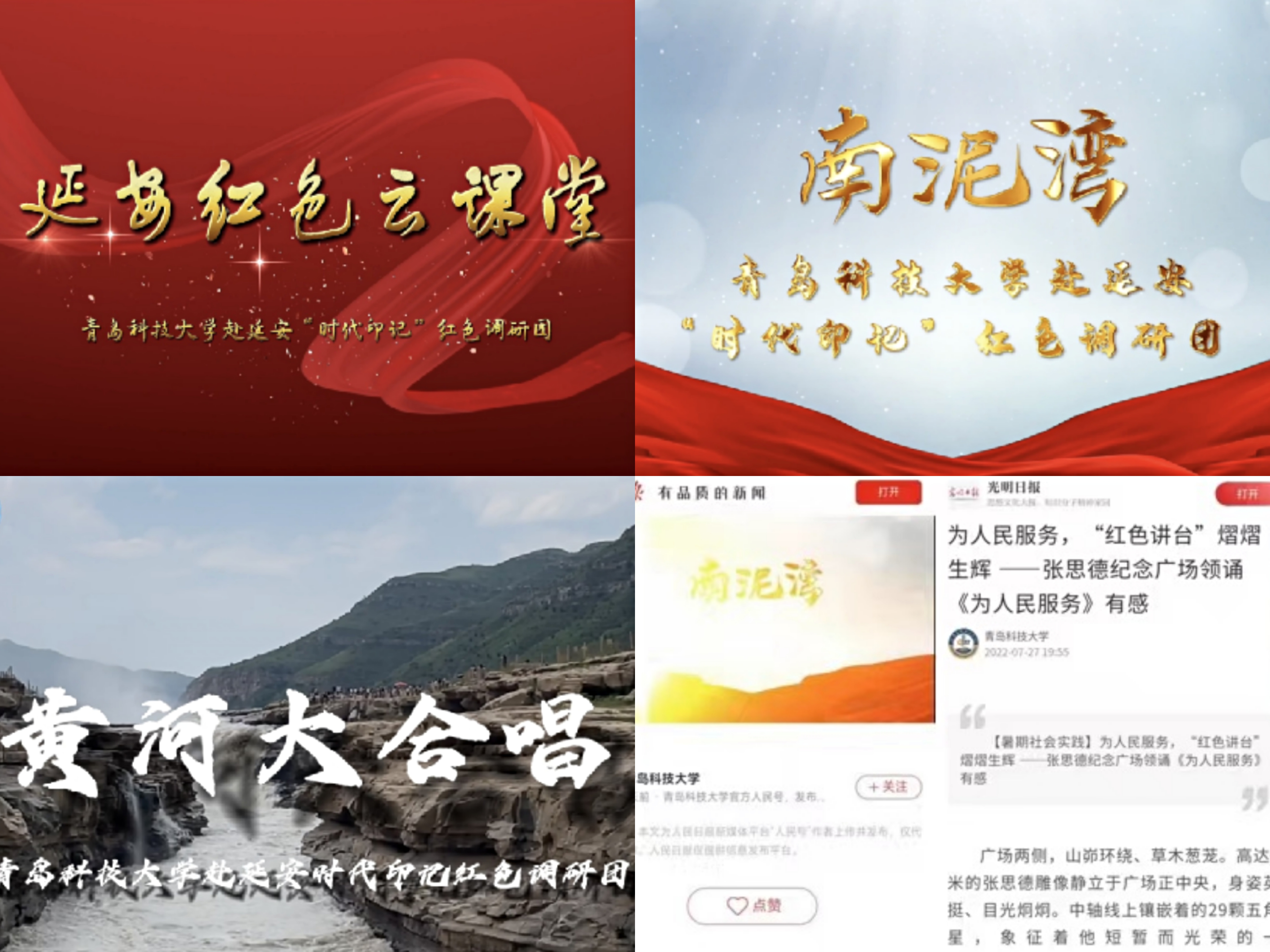 调研团追寻党的足迹,参观研学了延安革命纪念馆、抗大纪念馆、梁家河等红色圣地,秉承“边走、边看、边学、边讲”原则,创设“线上+线下”双实践特色化平台,创新课堂“打开方式”,开展特色党课、团课,通过“云课堂”上传视频号、公众号、抖音、微博、QQ、学习强国等平台;打造特色音乐思政品牌,队员们通过深情演唱《南泥湾》《保卫黄河》《抗大校歌》等红色歌曲,并自制MV向经典致敬,将零散的“思政元素”梳理成系统的“思政故事”,让思政课既有深度也有温度。截至目前,在23个国家级及省市级媒体平台累计发表云课程50余次,微视频10部,阅读量累计达18,7360次,把理论延伸到实践,在实践中嵌入理论,让队员在现实的场景、鲜活的事例和亲身的体验中学思践悟。其中《南泥湾》MV在学习强国、人民日报、光明日报、新华网、央视频、知乎、中国教育电视台、中国教育在线等多家官方平台进行发布和宣传,累计播放量超15.5万次。