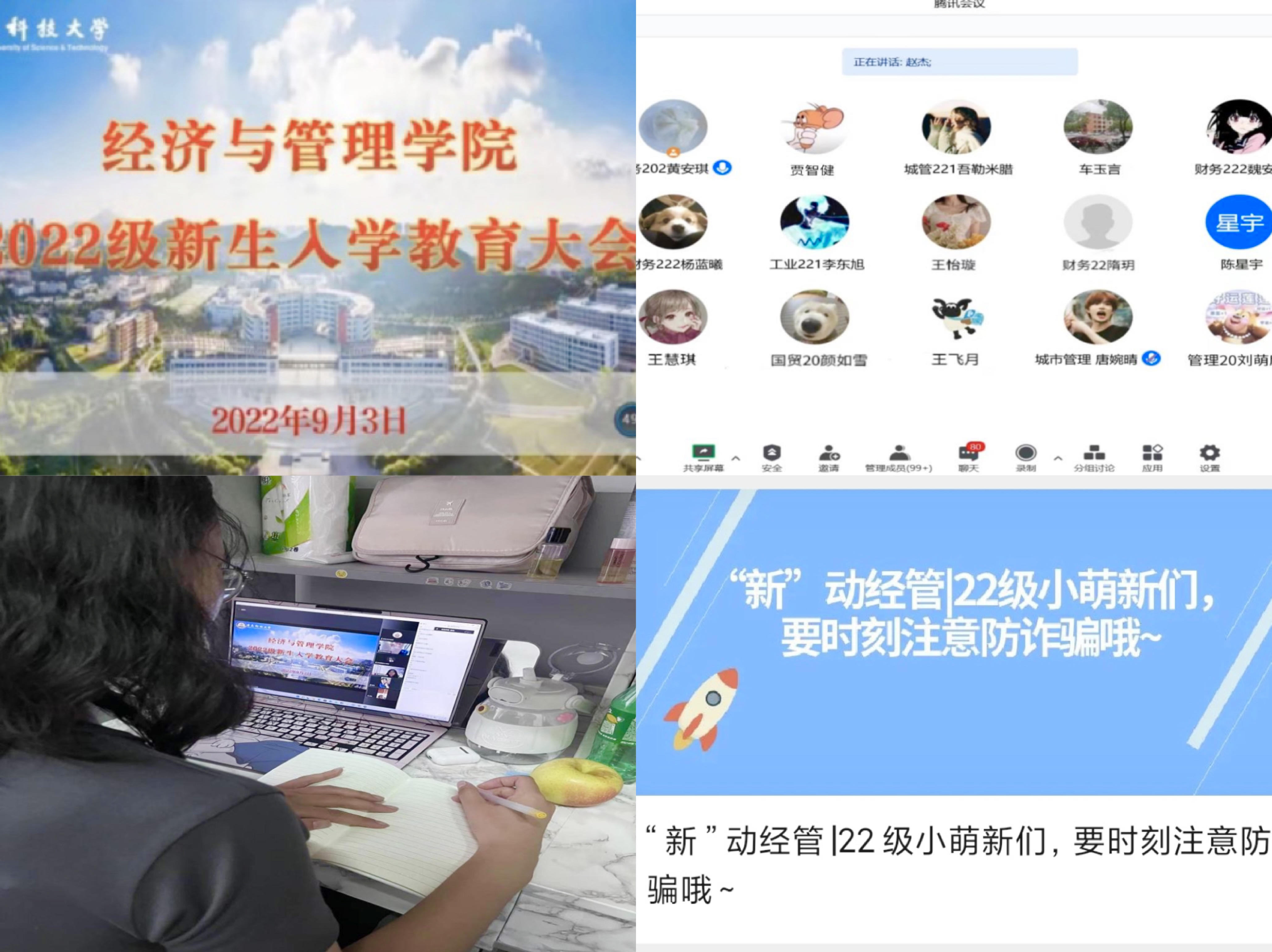 及专业简介大学校园生活、心理安全及防诈骗知识科普等内容,帮助新生提前融入大学环境新氛围;辅导员撰写“致全体2022级经管学子的一封信”,为新生送上开学前的第一份祝福;在官方抖音号进行迎新现场直播,方便新生家长实时关注新生入校报到的流程动态,走好家校合育第一步;根据疫情防控要求,新生入学后第一时间召开“青春向党,奋斗强国”线上教育大会,帮助新生强化专业认知与未来规划意识,开展爱校荣校教育,厚植新生爱国主义情怀,上好新生第一堂“思政课”。