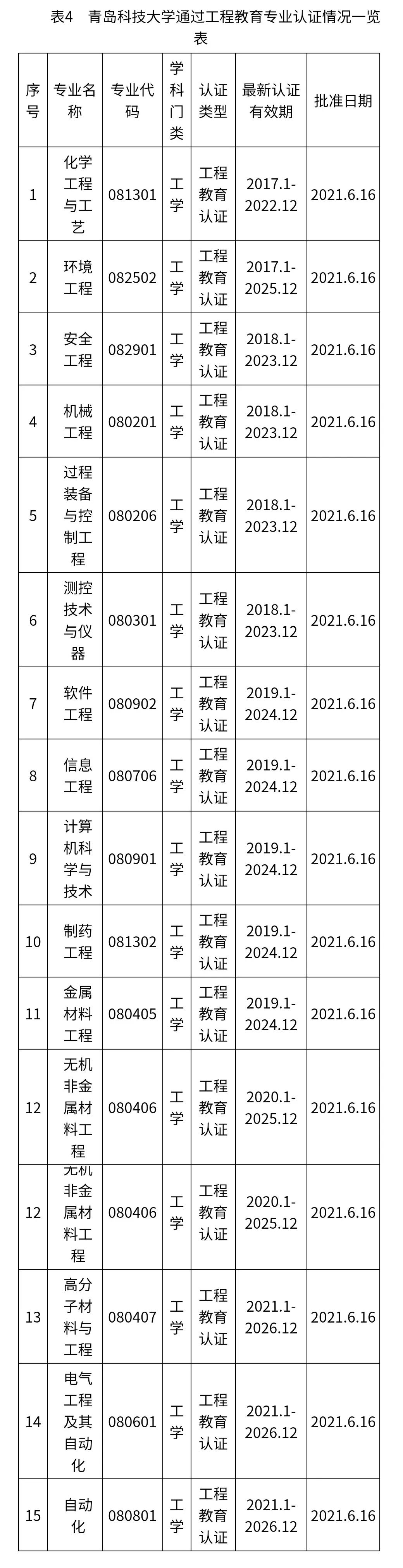 )3个微专业为立项建设项目。实行开放性与竞争性相结合、自我评估与学校评估相结合、相对稳定与动态调整相结合的管理机制。2021年10月,学校出台《青岛科技大学本科专业结构调整工作实施方案》,通过凝练专业方向、精简专业数量、优化专业结构,调整专业布局,优化学校资源的合理配置,形成“规模适度、结构合理、特色鲜明、目标明确、内涵突出、质量过硬”的专业建设新体系。2021年,学校停止专科招生;2022年,学校停招3个本科专业。争取到2025年,全校本科招生专业总数稳定在65个左右,专业结构进一步优化。