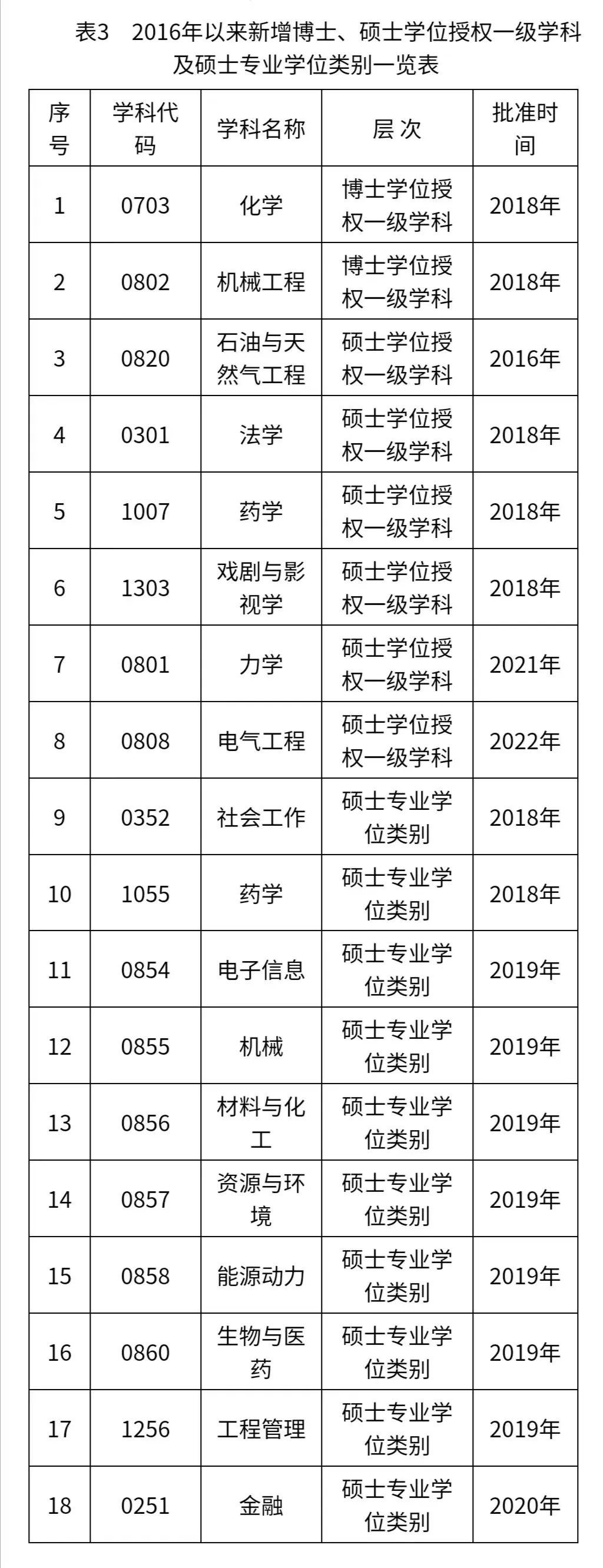 自2016年以来,学校获批化学、机械工程2个博士学位授权一级学科,法学、药学、戏剧与影视学、力学、电气工程5个硕士学位授权一级学科,社会工作、药学2个硕士专业学位类别。在工程硕士专业学位授权点对应调整工作中,将12个工程领域调整成电子信息、机械、材料与化工、资源与环境、能源动力、生物与医药、工程管理7个专业学位类别。学校坚持“有所不为”原则,主动撤销发展前景不好的精密仪器及机械、情报学2个硕士学位授权点,对应调整增列石油与天然气工程、金融2个硕士学位授权点(表3)。截至目前,学校共有5个博士学位授权一级学科,24个硕士学位授权一级学科,16个硕士专业学位类别,实现了各教学韦德国际