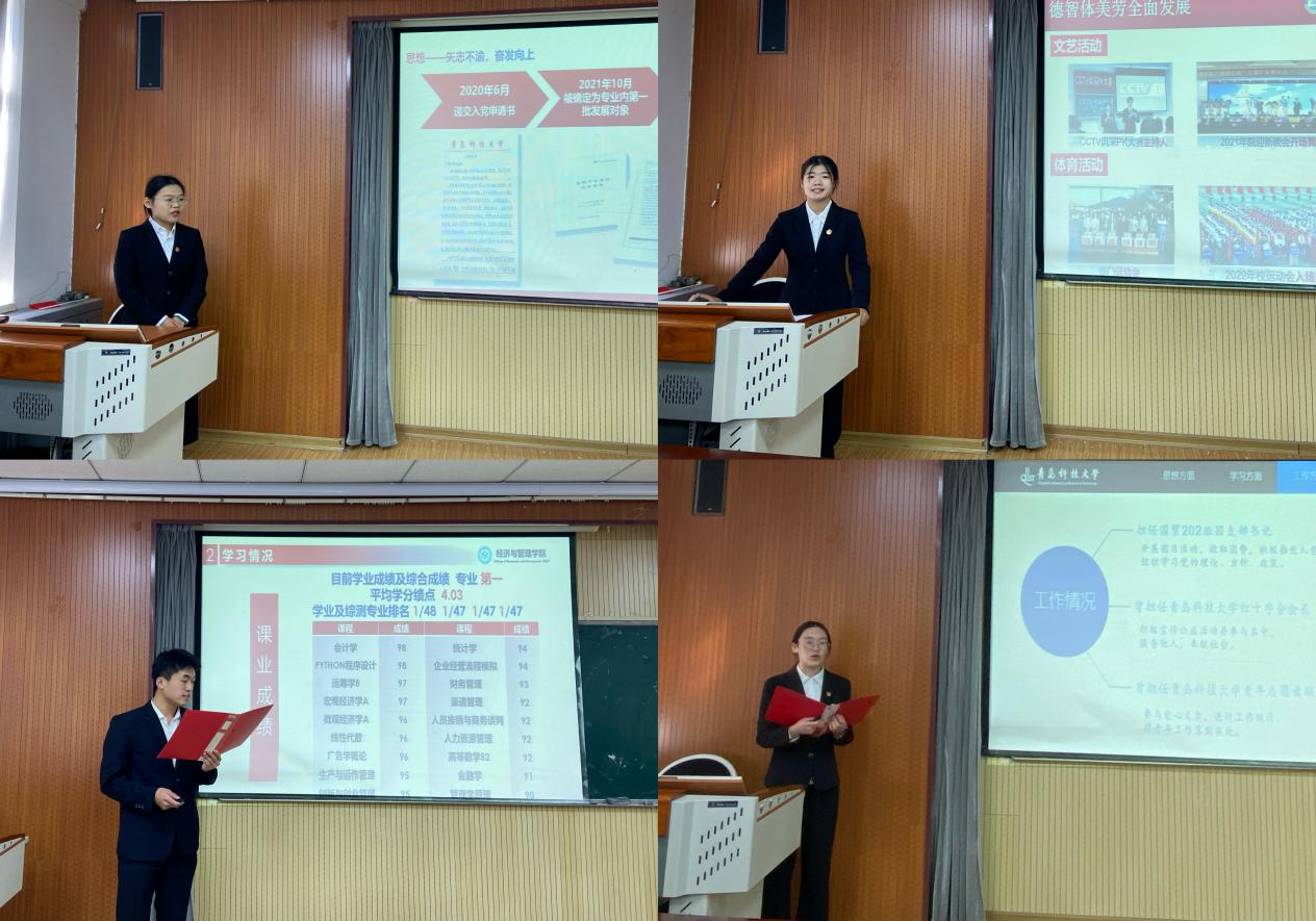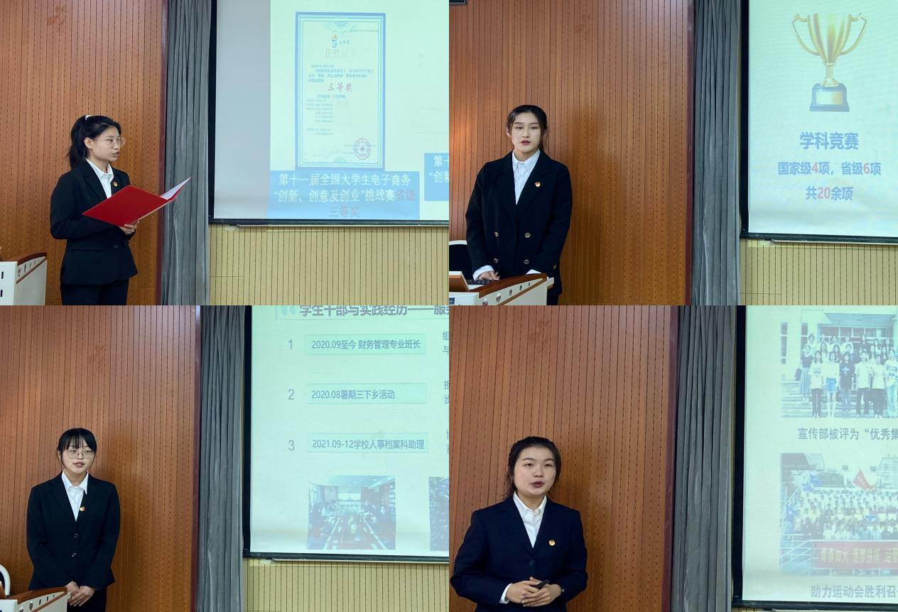 举行了2021-2022学年山东省国家奖学金、省政府奖学金答辩会。国贸191班王孟轩、财务(ACCA)191班王荔荣、物流192班王琳斐、财务191班张帆、物流192班李婕、工业191班曾梅花、营销202班王率龙、国贸202班刘汝童、管理202班苗孟飞、国贸202班闫佳琪、财务212班张一豪、管理211班胡尊鑫12名候选学生依次上台,从思想品德、学术科研、社会实践、服务同学等方面进行自我展示,充分展现了经管学子勤学善思、明辨笃行优秀品质。经韦德国际