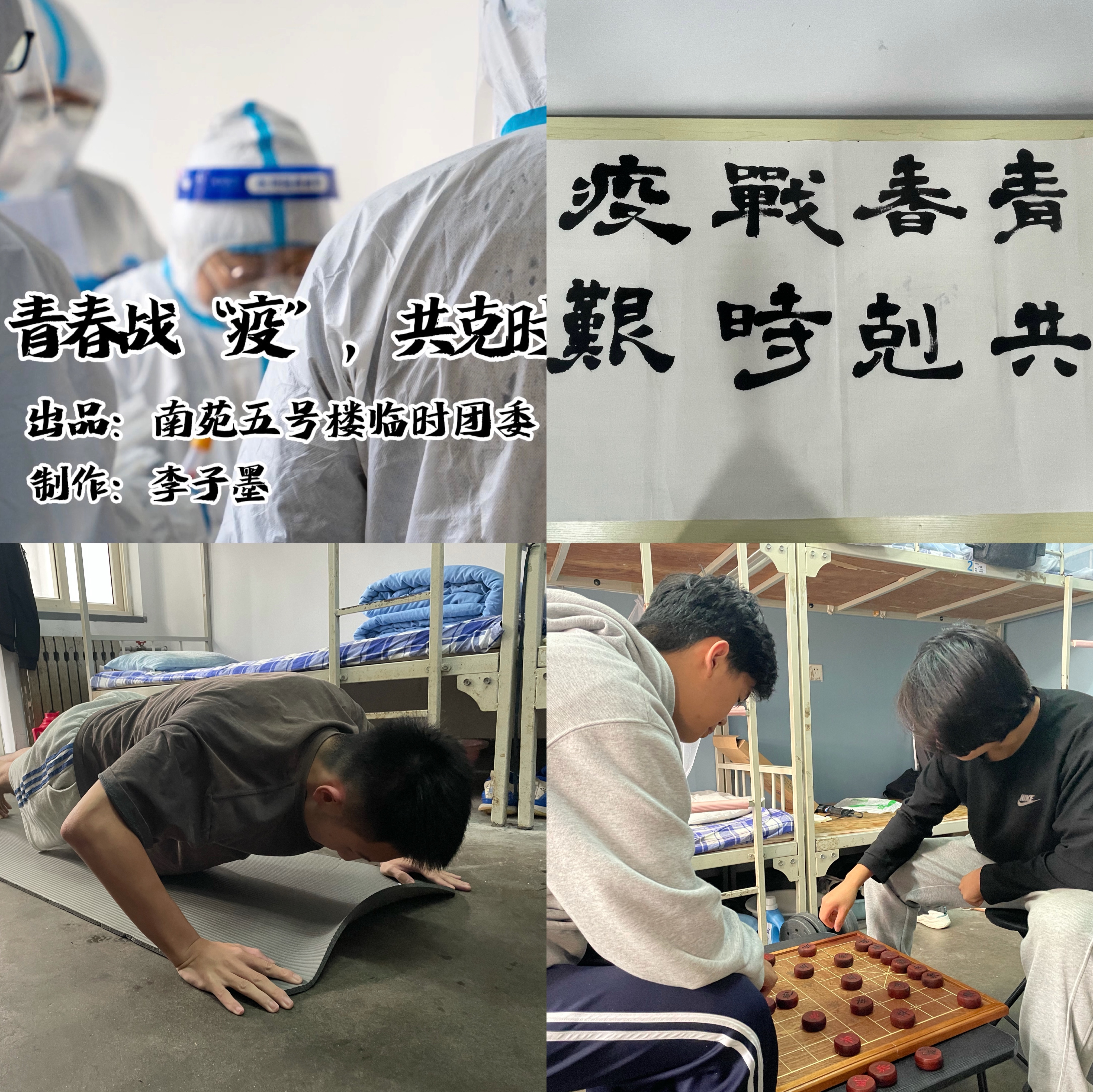 根据学校团委“抗疫有我 时刻准备 青春有为”主题系列活动方案要求,南苑5号学生宿舍楼战“疫”临时团委在静默管理期间组织开展“青春战‘疫’ 共克时艰”主题团日活动,通过思想引领、文化创作、体育运动等多种活动形式,把广团员青年“以点带面”全面动员起来,活跃学习、生活氛围,最广泛程度地凝聚起强大正能量。开展俯卧撑计数赛、静态平板支撑赛,用体育锻炼凝聚抗击疫情的“硬核力量”;开展象棋、五子棋等积极健康向上的益智类棋牌活动,舒缓静默隔离给学生带来的心理压力;通过绘画、书法等多种形式的宣传活动,将学生眼中所见、心中所思用作品展现,为参与防疫一线的志愿者们加油;制作《青春战‘疫’,共克时艰》主题MV,展现了疫情期间志愿者们在抗疫前线辛劳付出的身影和封校前后南五号楼里的温暖点滴,积极引导广大青年争做战“疫”的先行者、守卫者。