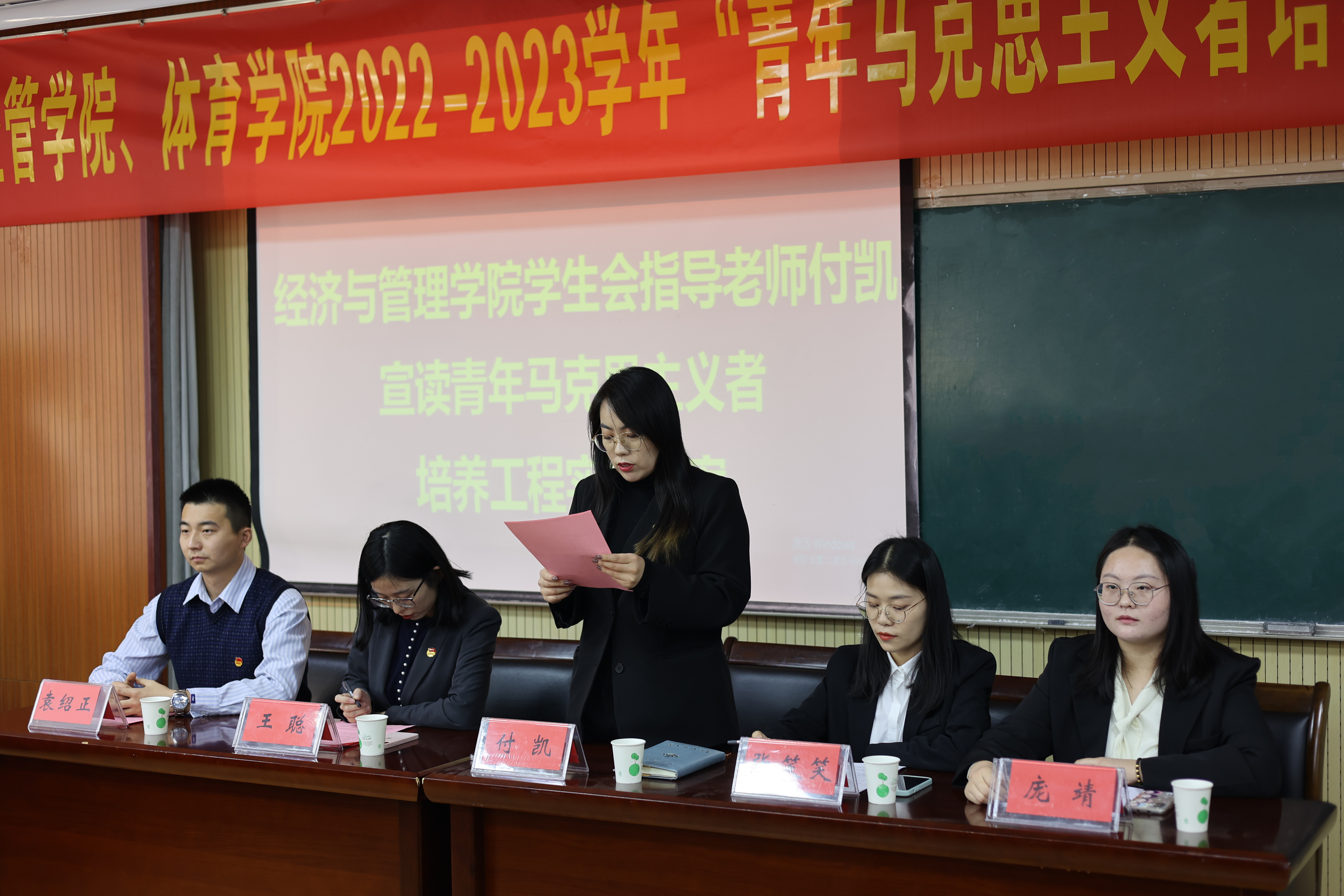 在经管楼419会议室举行2022-2023学年“青年马克思主义者培养工程”培训班开班仪式,团委老师及全体团学骨干与学员代表于线上线下同步参会。