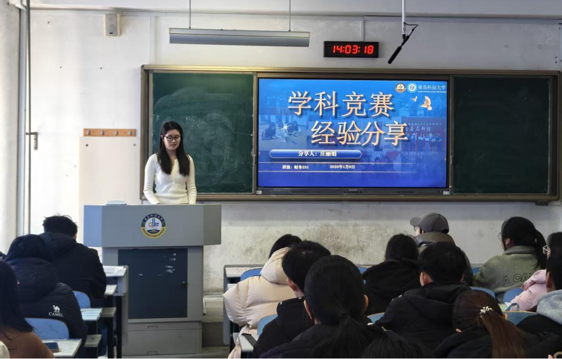 为将“1+1+1”特色班级建设理念贯穿班级发展全过程,激发学生参与学科竞赛的热情,帮助新生迈好大学生涯的“竞赛第一步”,1月8日,财务管理专业在崂山校区弘毅楼举办学科竞赛经验分享会暨特色班级建设会,本次活动由25级财务管理专业班主任于培友老师组织并主持,2023级庄丽娟同学主讲,25级财务全体同学共同参与。