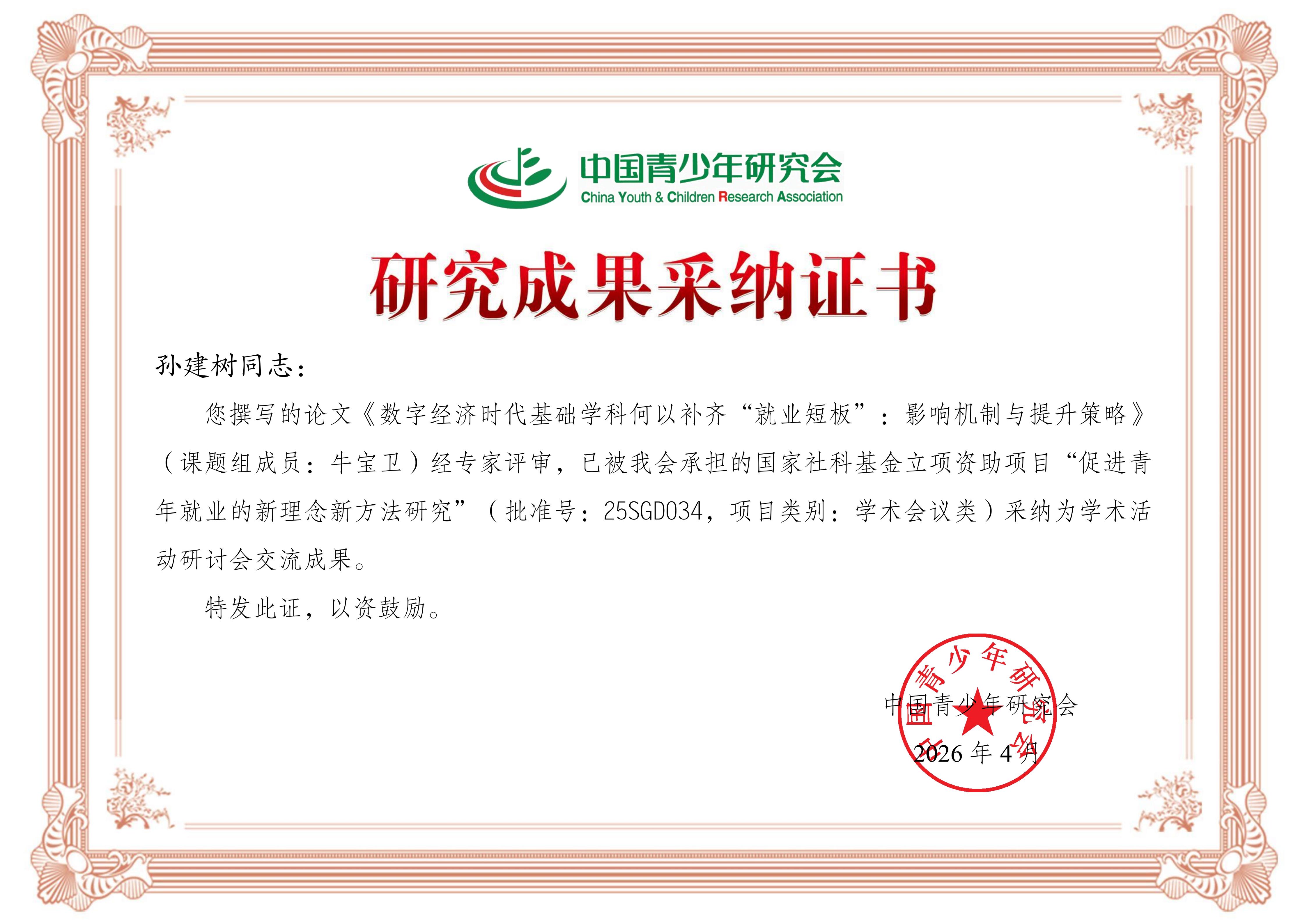 近日,中国青少年研究会发布促进青年就业的新理念新方法研究系列学术活动成果征集入选公告”,孙建树、牛宝卫报送的《数字经济时代基础学科何以补齐“就业短板”:影响机制与提升策略》入选现场交流成果。