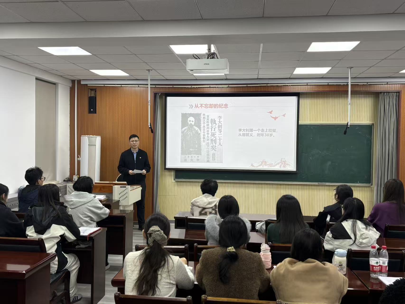 课上,付继航围绕李大钊同志的革命生涯进行系统讲解,全面回顾其作为中国共产主义运动先驱、伟大马克思主义者、杰出无产阶级革命家,为民族解放与革命事业不懈奋斗的光辉历程。从传播马克思主义真理、推动新文化运动发展,到为革命理想英勇就义,李大钊同志“铁肩担道义,妙手著文章”的崇高精神与舍生取义的家国情怀,深深感染在场每一位同学。全体团学骨干认真聆听、静心感悟,在重温英烈事迹中缅怀先辈不朽功勋,深刻感悟共产党人的初心使命与责任担当。