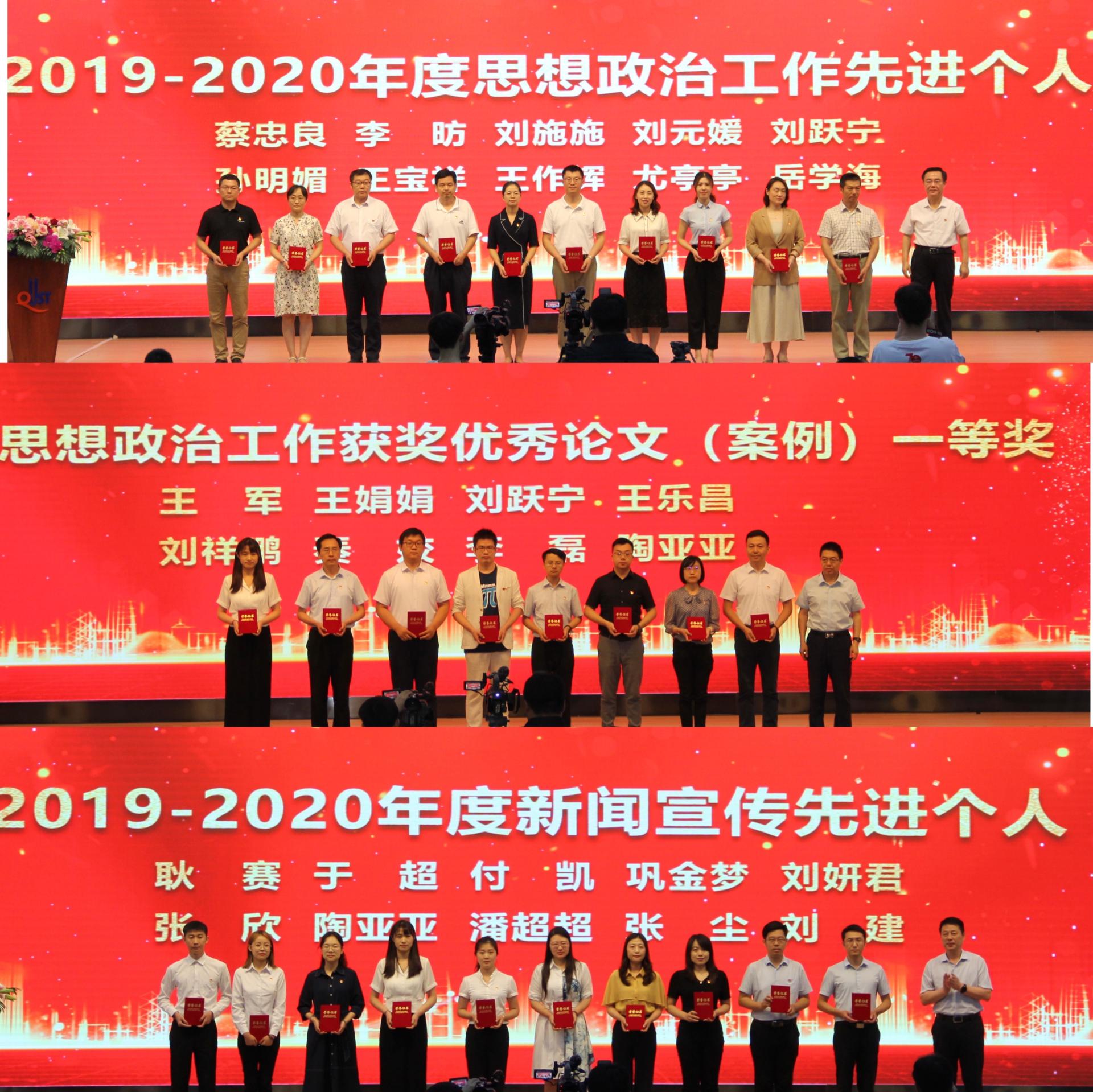 获评“2019-2020年度新闻宣传先进单位”、“2019-2020年度青岛科技大学优秀网站”称号,刘跃宁获评“2019-2020年度思想政治工作先进个人”,刘跃宁、孙一君、王聪撰写的论文获评“2019-2020年度党建与思想政治工作获奖优秀论文(案例)一等奖”,付凯获评“新闻宣传先进个人”。此外,王聪、刘跃宁、孙一君撰写的论文,张显全、李雯雯、孙一君撰写的论文获“优秀论文三等奖”。