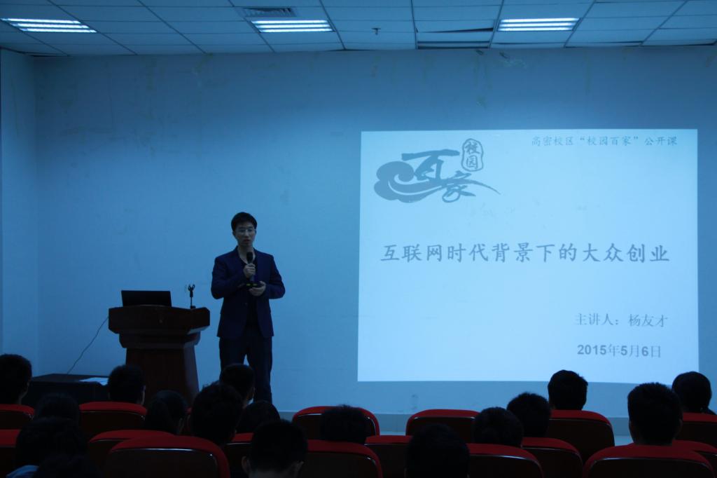 博士后杨友才做客公开课,为同学们上了一堂题为“‘互联网+’与创业——互联网的三个技术经济魔术”的公开课。