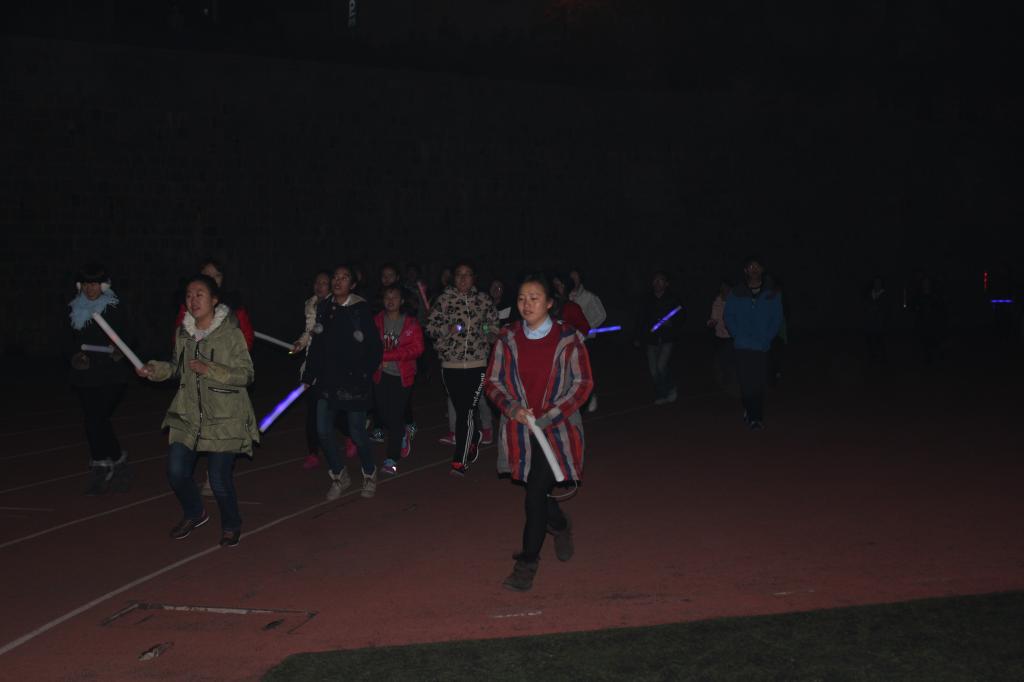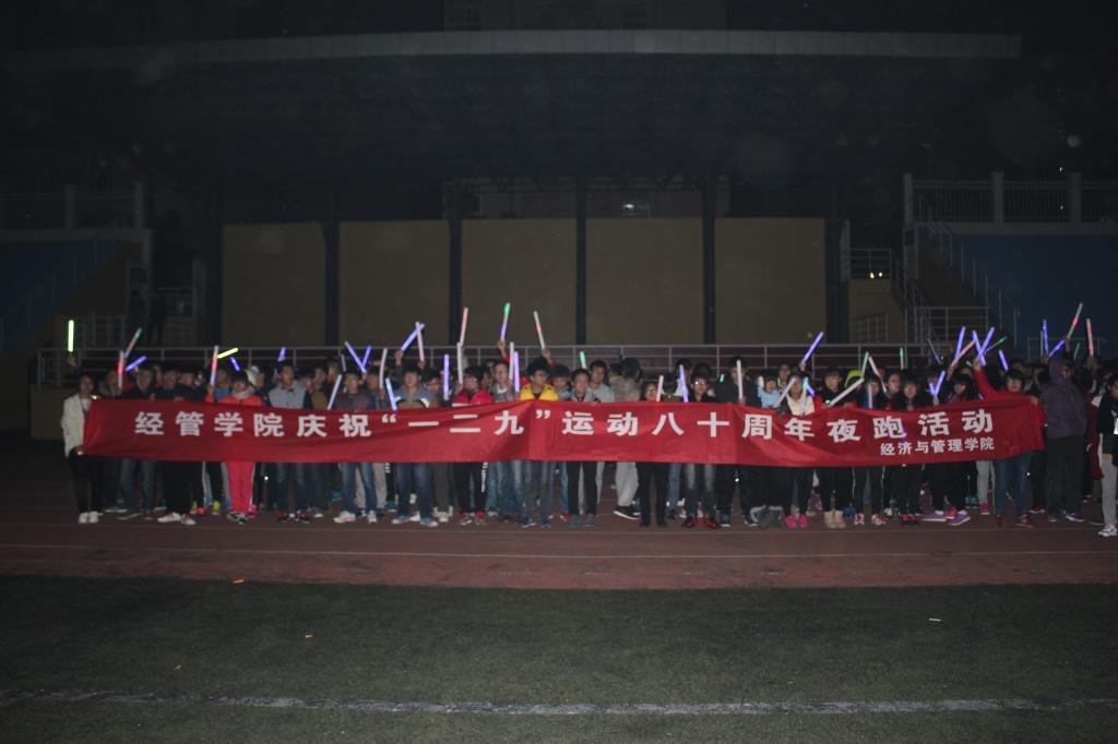 于南苑操场组织开展纪念“一二九”运动八十周年夜跑活动,近二百名学生准时到达集合地点,依次领取了荧光棒、指灯等装备共同参与了此次活动。