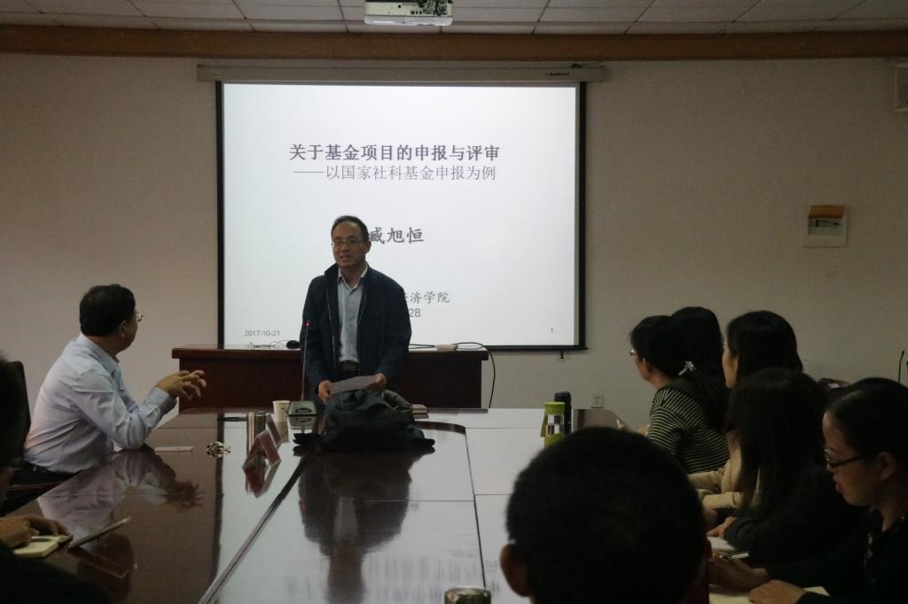 313会议室,青岛科技大学特聘教授臧旭恒老师为我院全体老师带来了题为《国家社科基金的撰写以及注意事项》的精彩报告,报告会由人文社科处处长李勋来主持,韦德国际