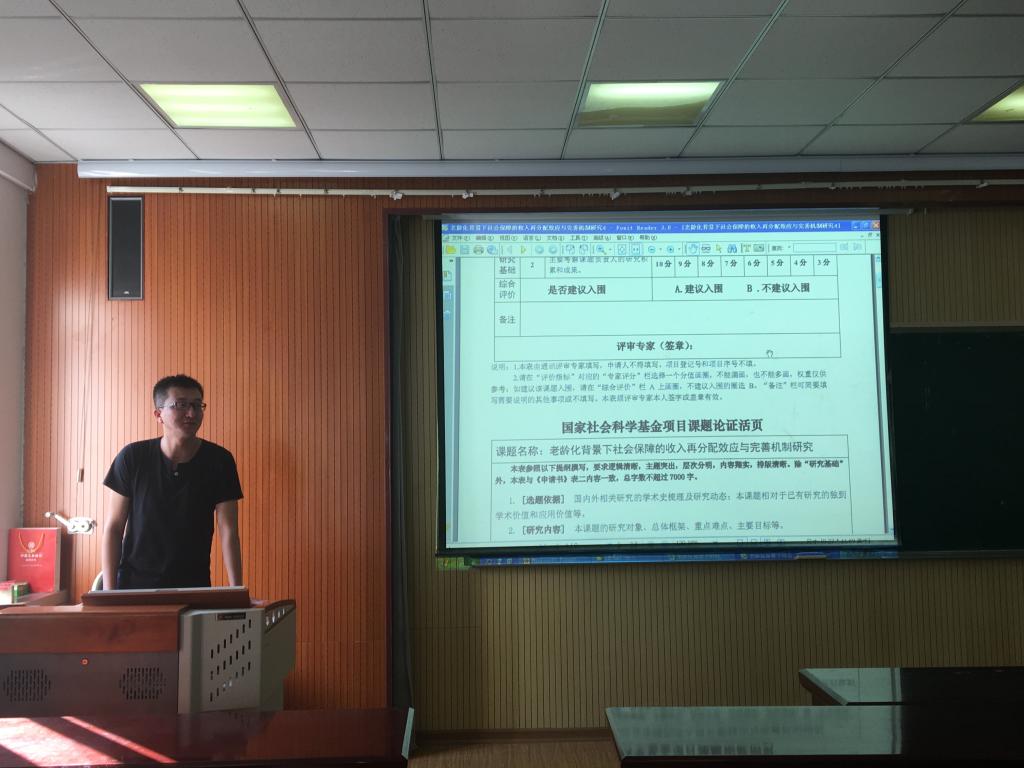 接下来由吕承超老师分享其立项课题《老龄化背景下社会保障的收入再分配效应与完善机制研究》的撰写经历和经验。首先他分享了其题目的修改过程,指出题目一定要明确,不应涵盖过多的研究点。其次对于申报书每一模块的撰写都要提纲挈领,紧扣要求。他强调在文献综述部分要一气呵成梳理出自己的观点,在研究内容部分一定要详实,至少罗列4至5条,在研究框架部分需要有逻辑性的用序号列示。在主要目标部分一定要具体化,切忌空洞。在创新之处部分要摒弃原来老套的“研究视角、研究方法”的创新,需将创新之处具体化。最后在研究基础部分指出,一定要结合现有课题的研究。