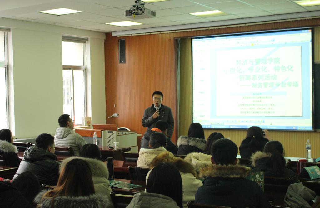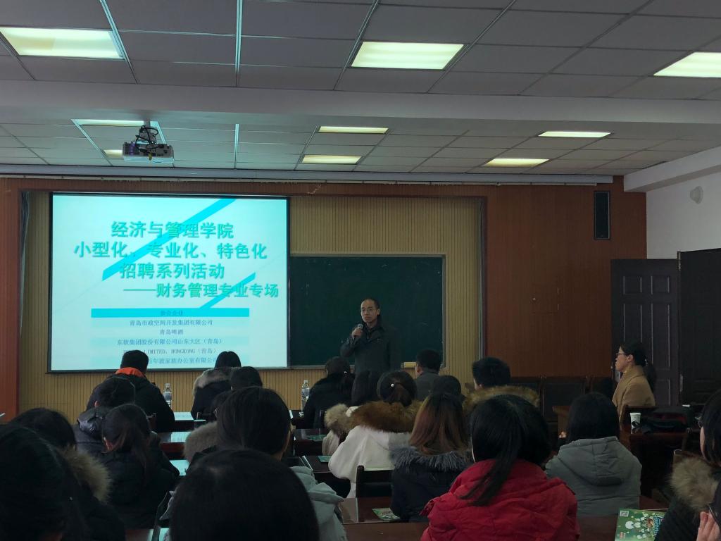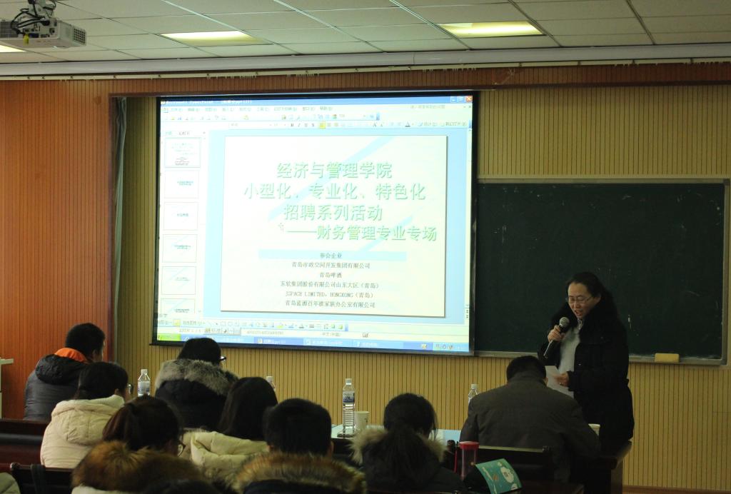 小型化、专业化、特色化招聘系列活动——财务管理专业专场在经管楼419室成功举办,青岛啤酒山东大区财务总监王国清\青岛市政空间开发集团有限公司子公司财务总监李翠艳、东软集团股份有限公司山东大区财务总监高雪松、JSPACE LIMITED HONGKONG(青岛)财务总监薛红梅、青岛百年渡家族办公室有限公司行政经理孟丽君代表企业前来招聘。韦德国际