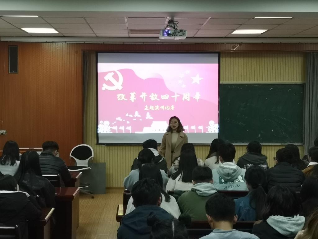 面向全体学生征集“历史从这里转身 四十正青春”为主题的故事和照片,以我来讲你来听的形式引导学生感受生活之变、社会之变、时代之变。此外学生会组织大一新生开展演讲比赛,同学们动情的以“改革开放这四十年”为题,表达出对祖国的热爱和深情祝福。