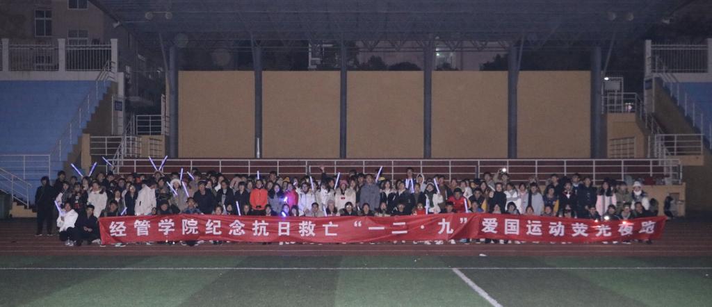 青春飞扬,点亮中国梦。12月9日晚, 400余名经管学子齐聚操场,参加一二九荧光夜跑活动。零下的天气挡不住同学们的爱国热情,他们手持荧光棒,精神昂扬,展现年少如风的锋芒,流动的荧光队列绵延数百米,融成一条闪耀青春之火的中国龙。激扬青春志,弘扬爱国心,家国情怀深植在每个学子心中。
