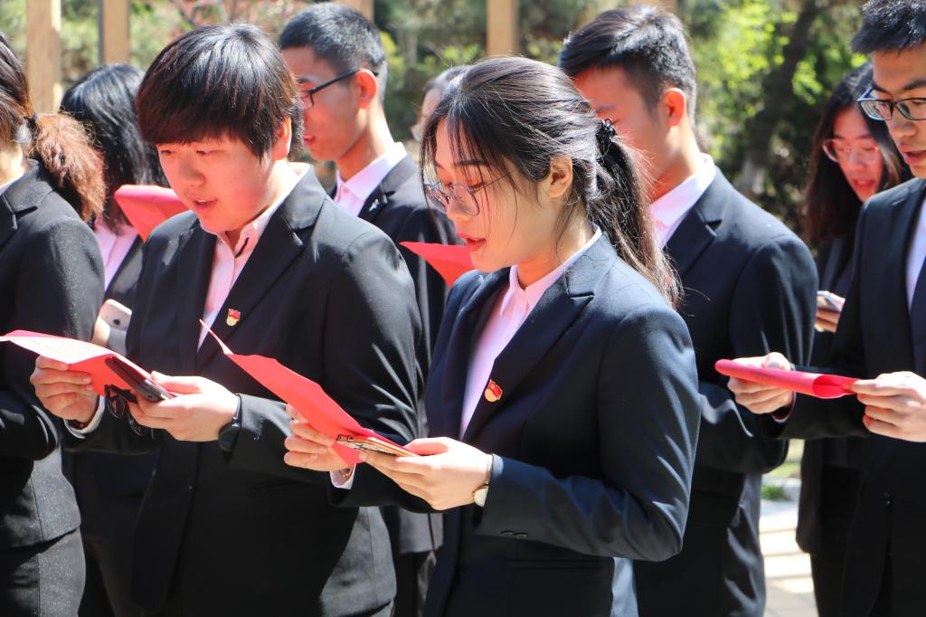 学生党支部开展“红色朗读--一党员一段文”红色朗读主题党日活动。苍翠的松柏下,肃穆的音乐中,财务(3+4)171班许心如、国贸162班欧阳文璐、物流161班程亚男、亓长智、薛明远依次带来朗诵《盛世中国》和《我是青年》,全体党员集体朗诵了《祖国啊,我亲爱的祖国》,红色书声,声声入耳,一场朗读,读出了新时代青年学子的雄心壮志和信心满满。随后,全体党员在鲜红的党旗下重温入党誓词,洪亮铿锵的声音,豪迈有力的誓言饱含了大家致敬先烈,传承英雄精神的坚定决心。党员们纷纷表示,将汲取红色力量,把对革命先烈的怀念和敬仰之情,转化为立足本职、敢为人先的力量,将个人发展与国家命运相结合,真正做到“内化于心,外化于行”。