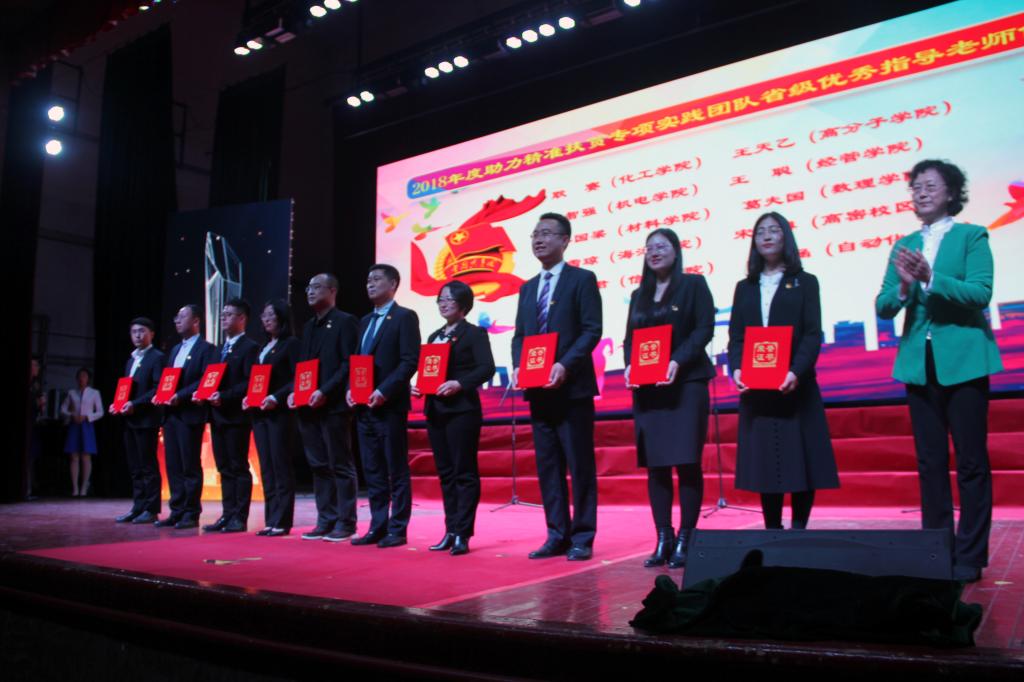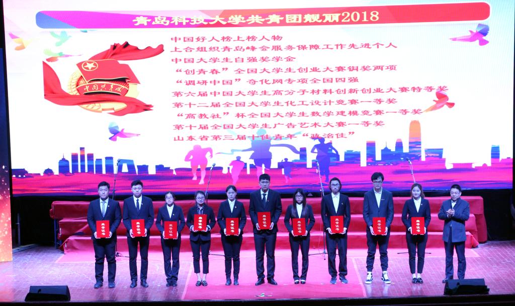 榜样青春颁奖典礼对2018年度在基层团建、创新创业、社会实践、志愿服务、校园文化活动等方面进行了总结,大会表彰了“红旗分团委标兵”称号、“扶贫专项计划省级优秀指导老师”、获“创青春”全国大学生创业大赛获奖团队、校第十二届“十大杰出青年”、“青岛科技大学十大学生”等先进集体和个人,在全部表彰项目中均有我院优秀代表登台领奖。