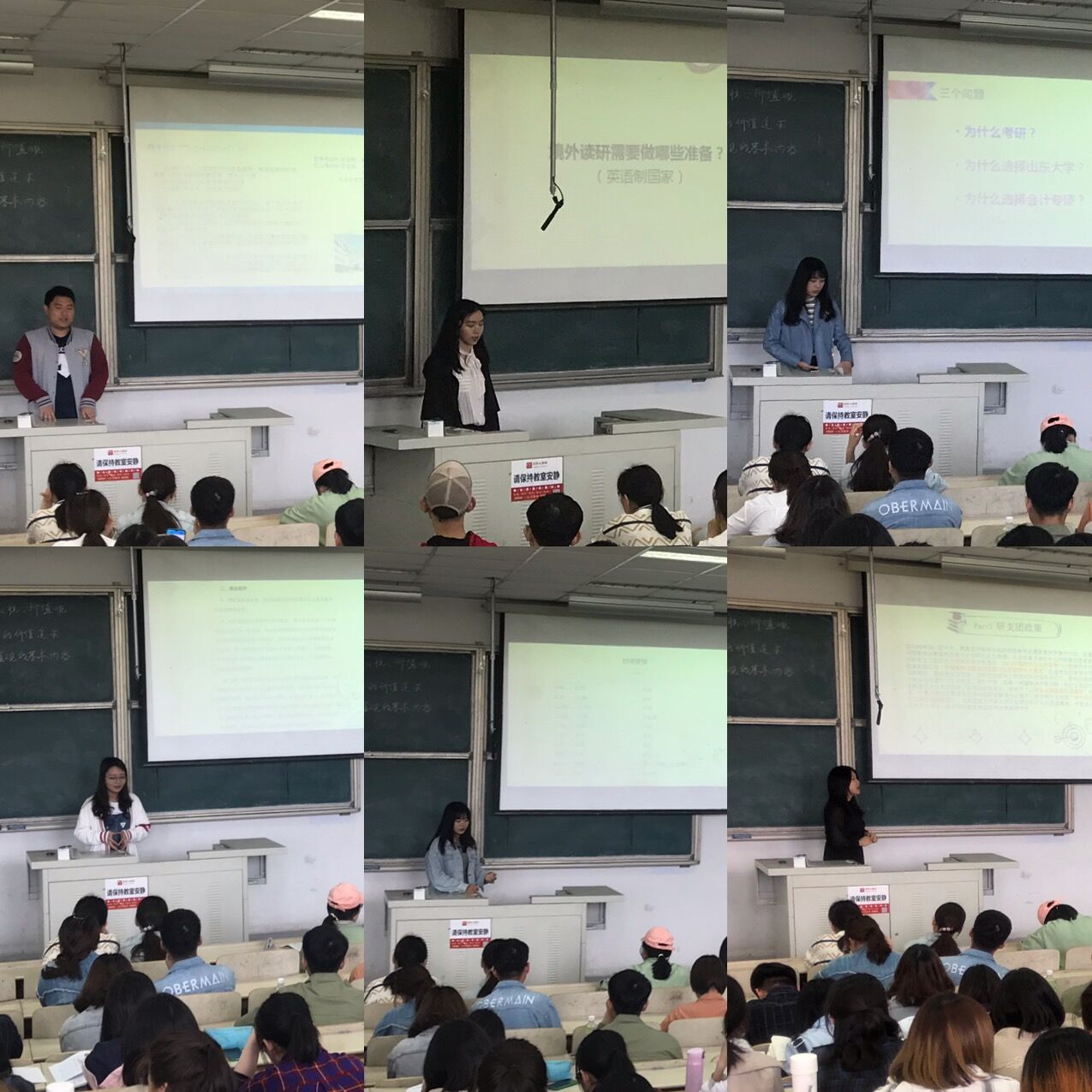本次分享会邀请了财务151班宋一璇、物流152班卢运媛、国贸151班初桂民等6位在考研方面取得突出成绩的学长学姐。分享会上,考取华北电力大学的物流152班卢运媛学姐用自身在考研准备过程中遇到的雷区警醒大家不要走“考研的弯路”,她认为考研的成功在于正确的方法加持之不懈的努力,风趣的语言、清晰的条理、看门见山的风格,赢得了同学们阵阵热烈的掌声;考取山东大学会计专硕的财务151班宋一璇学姐为在场同学讲述了一个不负努力,成功逆袭的故事,她普及了专硕与学硕的相关知识,强调了考研过程中一定要保持良好的心态,针对各学科的复习进度及技巧做了详细的解读;保研至北京工商大学的管理151班张跃从自身保研经历入手,针对订立考研目标、考研方法的筛选、考研院校的选择及考研导师联络等方面与同学们展开交流探讨,并细致梳理了如何获得推免资格、推免流程及注意事项等问题;考取青岛科技大学的国贸151班初桂民则从选取学校,选取专业的几个小故事入手,用身边人身边事给大家做了目标制定、计划执行的针对性指导;拿到南加州大学录取通知书的国贸151班吴越则从出国申请、材料准备及个人规划等各方面为大家做了出国申请的详细介绍;入选第21届研究生支教团的管理151班郑琦学姐动情为大家讲述了研支团政策和她的初心,鼓励同学们投身志愿服务,展现新时代青年的担当。