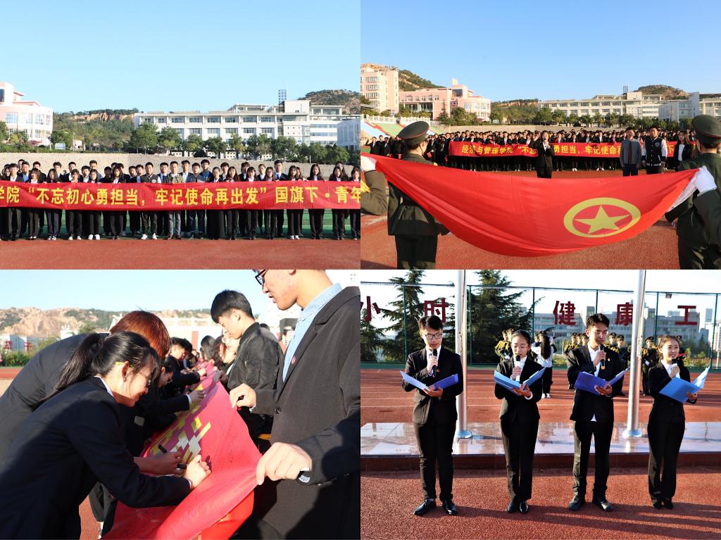 组织大一大二全体学生于崂山校区运动场举办“不忘初心勇担当 牢记使命再出发”国旗下青年说主题教育活动,依次进行了升国旗唱国歌、国旗下的演讲、经典现代诗朗诵《我的祖国》、重温入团誓词等环节,给经管学子上了一堂生动的爱国思政课。工业182班赵宜政充满干劲说道:“用青春梦激扬中国梦,让爱国情化为报国行。我们每一位学生都应该立足本位,认真汲取专业真知,密切关注社会热点,积极投身实践历练。在新的时代,接过历史接力棒,砥砺奋斗勇担当。”