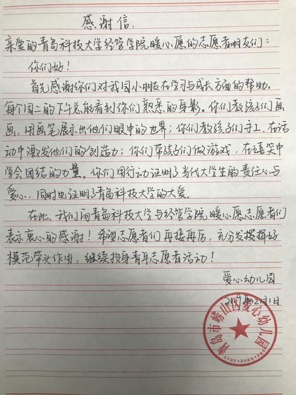 信中特别表扬暖心愿志愿服务团队的志愿者们始终坚守初心,勤勤恳恳、不辞辛苦,坚持为崂山区爱心幼儿园的小朋友们献爱心、送温暖。这封感谢信是对我院志愿服务工作的高度肯定和赞扬,同时也是对志愿者们的认可。青年志愿者协会也将一如既往,更加努力,为韦德国际