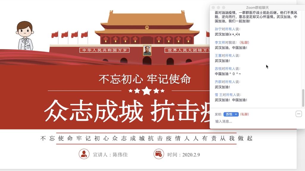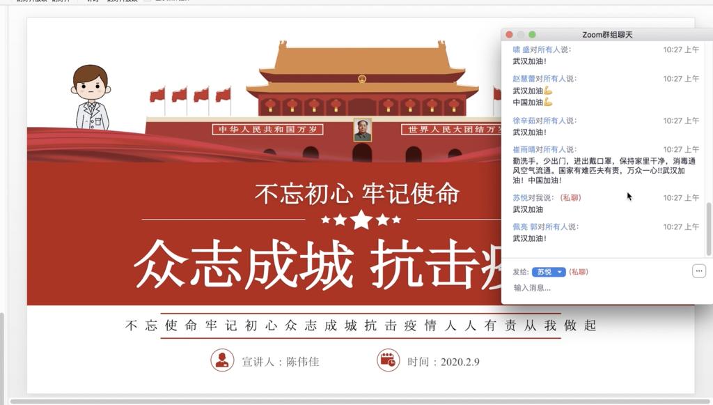 在班委和各位寝室长的配合组织下,团支书陈伟佳利用zoom会议平台开展了疫情防控知识普及学习,主要以PPT为主,从(一)总书记就抗击疫情给出“最强攻略” (二)什么是新型肺炎(三)疫情防控工作(四)守初心担使命,打赢疫情防控狙击战四个方面展开。