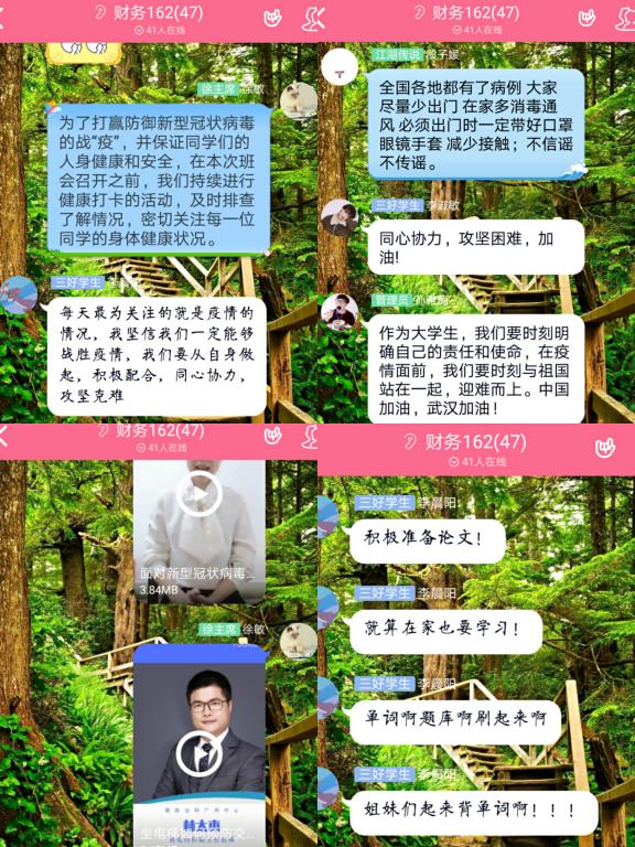 在线上班会开始的时候,同学们在班级群里积极开展讨论,纷纷建言献策,分享自己对这次卫生防“疫”战的看法。李晨阳同学说:“每天最为关注的就是疫情的情况,我坚信我们一定能够战胜疫情,我们要从自身做起,积极配合,同心协力,攻坚克难。”孙雅楠同学说:“作为大学生,我们要时刻明确自己的责任和使命,在疫情面前,我们要时刻与祖国站在一起,迎难而上。中国加油,武汉加油!”