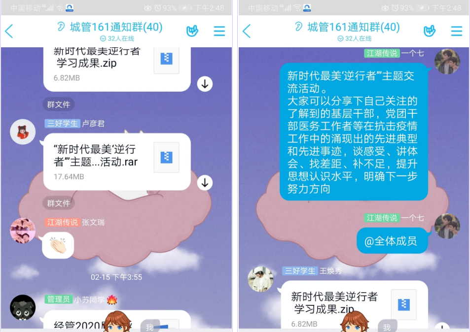 为组织进行更好的交流,同学们分享自己关注的、了解到的基层干部,党团干部医务工作者等在抗击疫情工作中的涌现出的先进典型和先进事迹,谈感受、讲体会、找差距、补不足,以提升思想认识水平,城管161团支部以新时代最美‘逆行者’”为主题,线上分组进行小组讨论,在“微博热点”“时事分享”“畅所欲言”等环节中,各组通过各种方式分享了交流自己的心得体会。