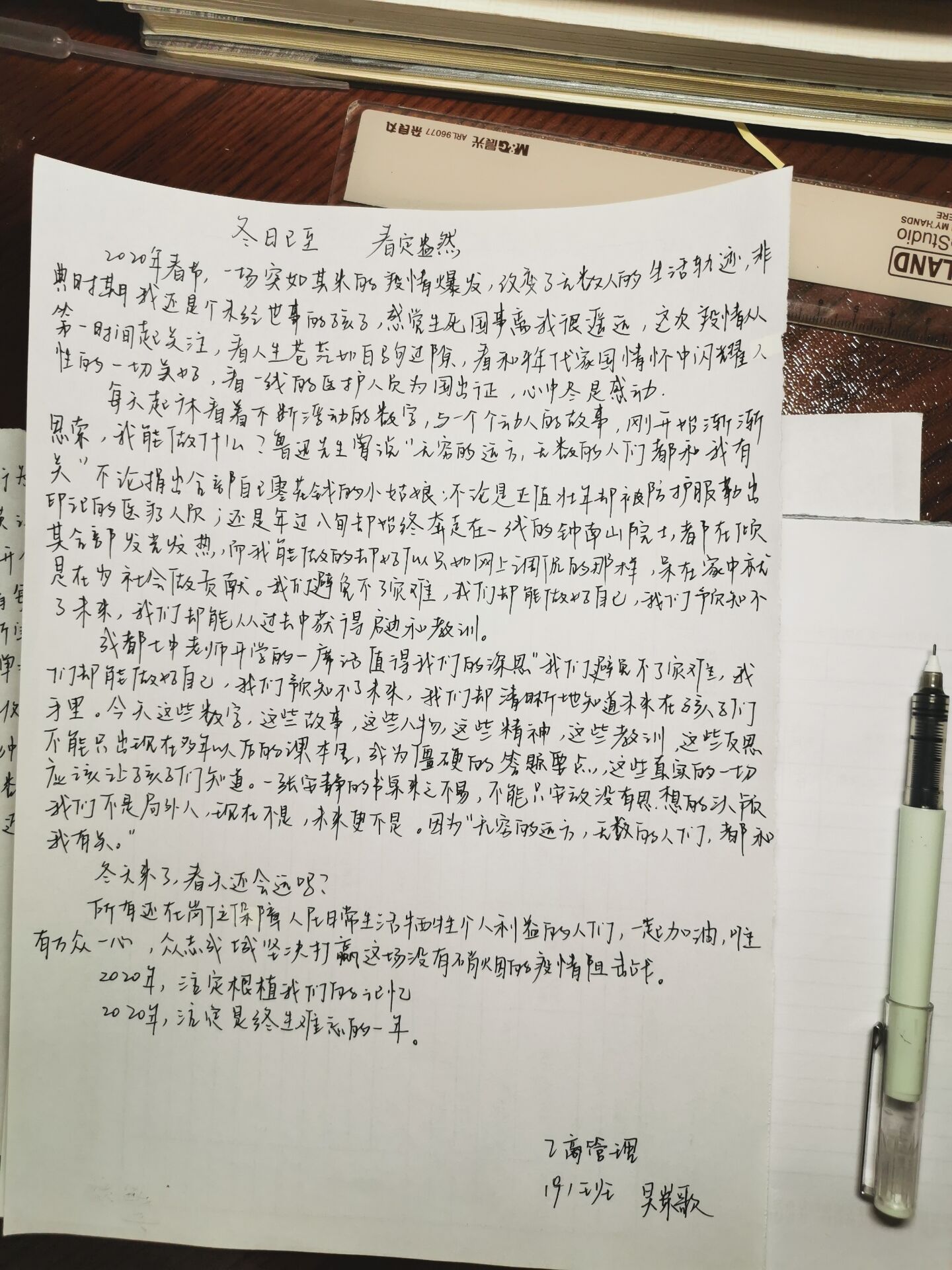 “天下山河清影在,人间风雨此宵同”,一场战“疫”牵动着无数人的心,全国人民同心协力,齐心抗“疫”。我们可以看到毅然决然写下“请战书”的医护工作者;没日没夜建设火神山医院的施工人员;不计较个人得失,用善意搭建桥梁,驰援物资的爱心人士.......他们用行动向我们诠释了什么是大爱无疆,什么是“新时代最美‘逆行者’”。在新冠肺炎疫情防控阻击战的关键时期,涌现出一批批“逆行者”,值得我们学习,值得我们敬仰。作为当代大学生,作为新时代的青年,我们有责任,有义务共克时艰,响应国家号召。