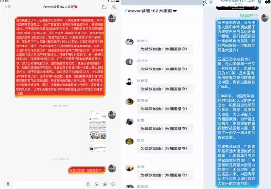 城市管理182班团支部回顾了习近平总书记的五四青年讲话中对新时代青年提出的六点希望,组织同学们观看了人民日报战疫视频和最美英雄事迹,最后同学们纷纷表示青年一代是祖国发展和民族复兴的重要力量,共青团员更是党的助手和后备军,在危难时刻就要挺身而出不怕牺牲。面对疫情,新时代的青年大学生要向“最美逆行者”们学习,多做贡献不添麻烦,为武汉加油,为祖国坚守!
