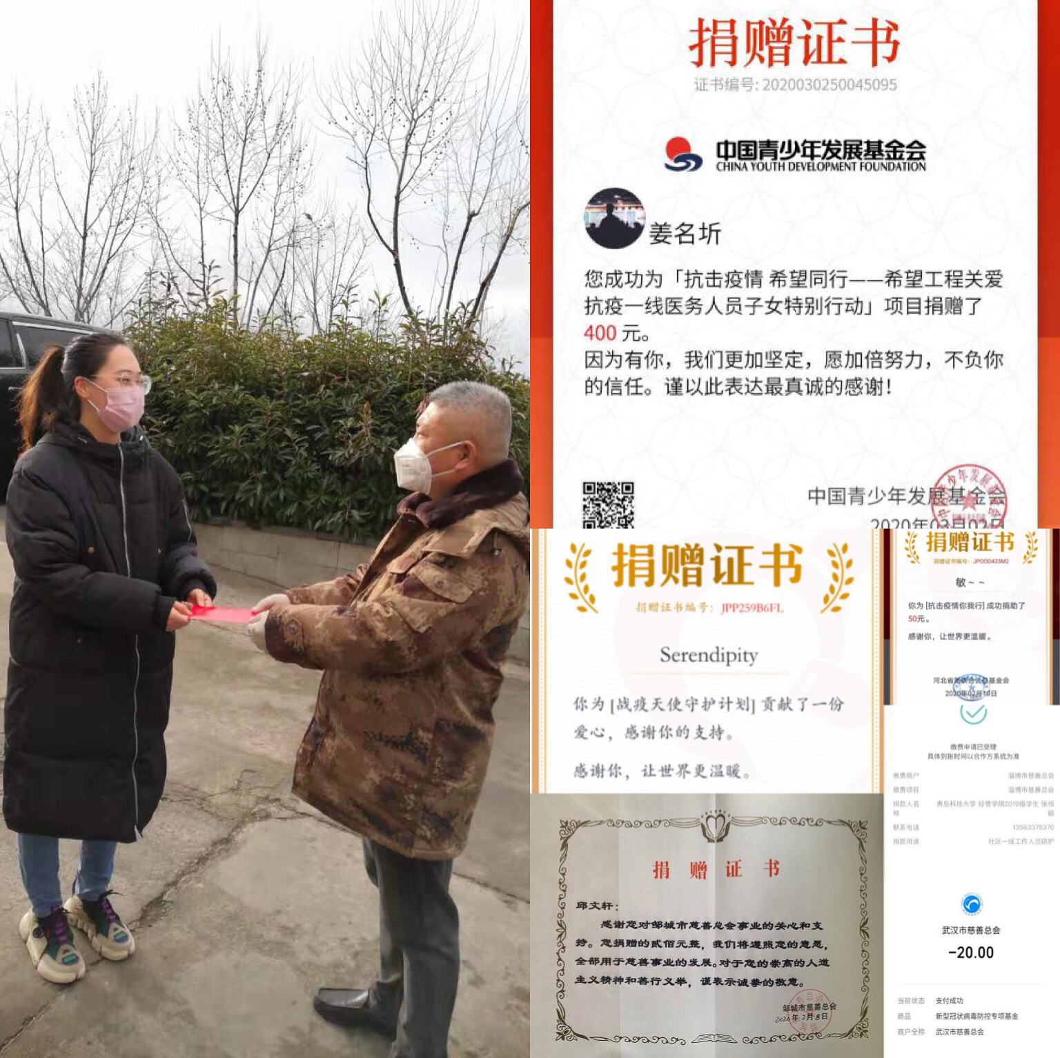 在这场战役中,人人都是参与者,人人都是见证者。财务管理(3+4)161班曲飞、财务181班邱文轩、营销162班韩苗苗、财务192班王心雨、营销192班阚晓敏、ACCA192班张恒硕等同学纷纷通过官方渠道积极参与到疫情防控捐款活动中,为抗击疫情贡献爱心。其中,担任青岛科技大学崂山校区学生会执行委员会主任及城管171班长的姜名圻同学不仅主动捐款500元,并且号召全班同学根据自身情况为抗击疫情自愿捐款,带领同学提高责任意识、增强奉献精神。