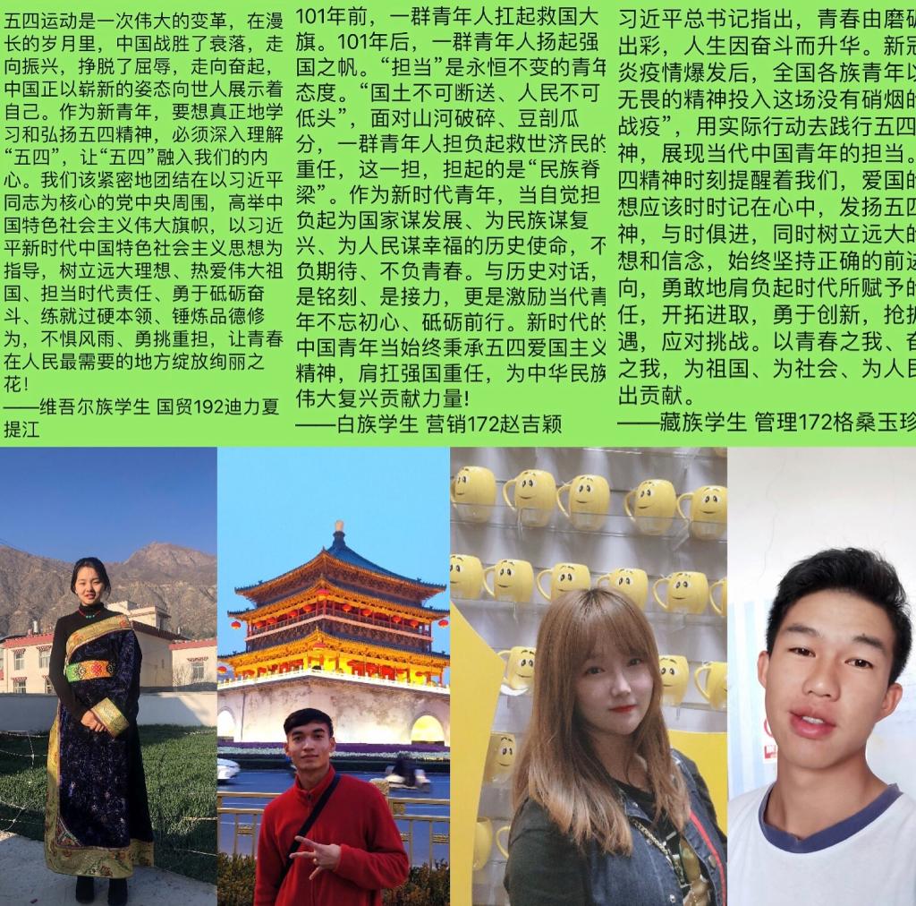 开展了“各族共筑中国梦,爱国精神永流传”少数民族“青年说”活动,带领少数民族学生回顾疫情期间涌现出的90后“最美逆行者”感人事迹,通过视频会议“云分享”学习感悟,共同上好这堂青春大课、信仰大课。市场营销162班维族学生热依汗感慨发言:“青年一代有理想、有本领、有担当,国家就有前途,民族就有希望。1919年,青年为国奋起,奔走街头;2020年,青年秉承先志,一线抗疫。危难关头,‘我上’是青年的誓言,‘不退’是青春的姿态!”