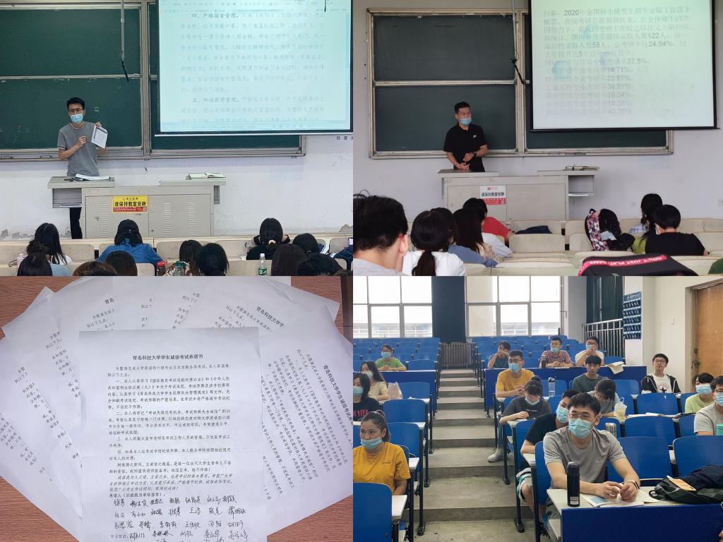 根据常态化疫情防控特殊时期的教学方式、考试形式的新变化,按照《关于做好2020年春季学期考风考纪教育工作的通知》的具体要求,张显全结合往年考试违纪的典型案例,告诫同学们在考试中要严格遵守考场规则,虽然学习形式考试方式会变,但是诚信考试的行为规范永远不会变,要用诚信之心敬畏纪律,敬畏考试,切勿违纪作弊。同时,号召全体同学要倍加珍惜来之不易的战“疫”成果,尽快调整学习状态,努力学习专业知识,以饱满的精气神投入到今后的学习生活中。随后,全体同学认真学习了《青岛科技大学学生纪律处分管理规定》等规章制度中有关组织作弊、替考、考试作弊等违纪处分相关规定,并现场签署了《青岛科技大学诚信考试承诺书》。