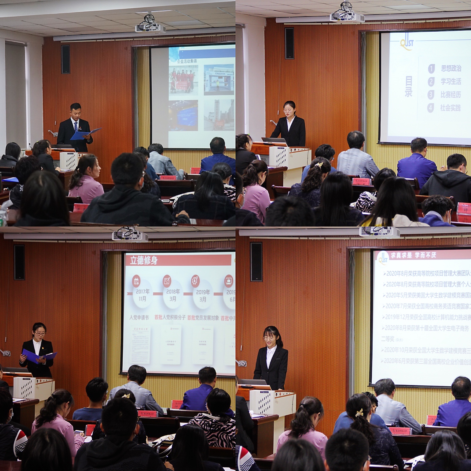 举行了山东省国家奖学金、省政府奖学金答辩会。城管182班袁炳顺、财务172班姜泓宇、物流172班姚天 姿、财务(ACCA)172班李珊珊、营销172班肖映彤、财务(3+4)171班许心如、城管172班姜延杰、物流182班彭承琪、管理181班韩育、国贸182班刘畅、营销192班马小淳、财务181班王倩、工业171班岳玲玲、财务(3+4)181班张洲卉、工业182班高广旭、管理192班张娜等16名候选学生依次上台,从个人经历、学习情况等方面全方位进行了个人风采展示。