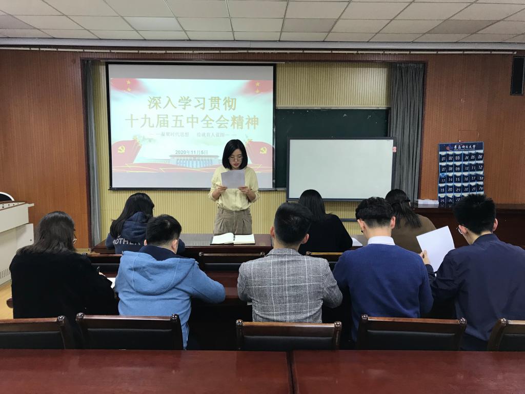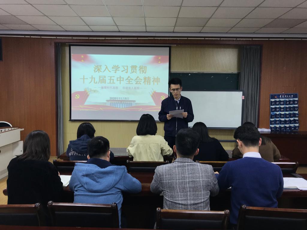 会上,王聪首先领学了《十九届五中全会的公报要点》,对“一个重要判断”、“我国当前发展环境面临的复杂变化”、“决胜全面建成小康社会取得的10方面决定性成就”、“9方面远景目标”、“经济社会发展的6方面主要目标”和“实现奋斗目标的12方面具体举措”进行说明和剖析。王聪指出,十九届五中全会精神高瞻远瞩,为教育工作者绘就了育人蓝图。首先,会上提到的“繁荣文化事业和文化产业,提高国家软实力”,及“建成文化强国、教育强国、人才强国”的要求,为高校青年教育管理工作指明了战略方向。辅导员作为学生成长成才的“主抓手”,要将立德树人根本任务贯穿教育管理始终,强抓思想建设,激活育人形式,突出文化引领,凝聚价值追求,使育人目标与国家政策相匹配,将育人结果与社会需求相吻合,切实把稳育人航向,巩固教育硕果。同时,辅导员要以十九届五中全会精神为导向,自觉将思想与行动统一到全会精神上来,做到常学常用、活学活用、严学深用、实学实用。