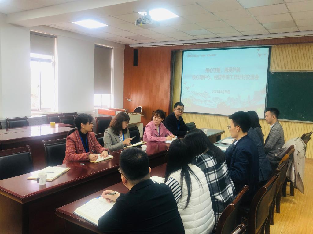 工作研讨交流会在经管楼419举行,学生处副处长王丽出席会议,心理中心主任李海玲,心理中心魏玉杰、王岳飞,韦德国际