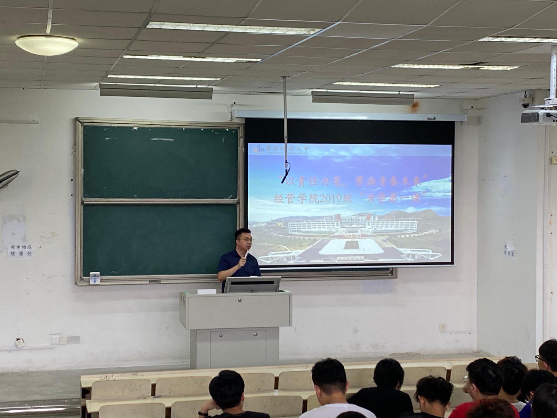 2019级分专业召开“以责任为笔,擘画青春未来”开学第一课,从“学习党史悟思想”、“常态防疫不松懈”、“学风纪律放心上”及“考研就业早规划”四个方面对返校学生进行了全方位开学教育与价值引领。会议由2019级辅导员孙一君、赵杰主讲,2019级全体学生参加。
