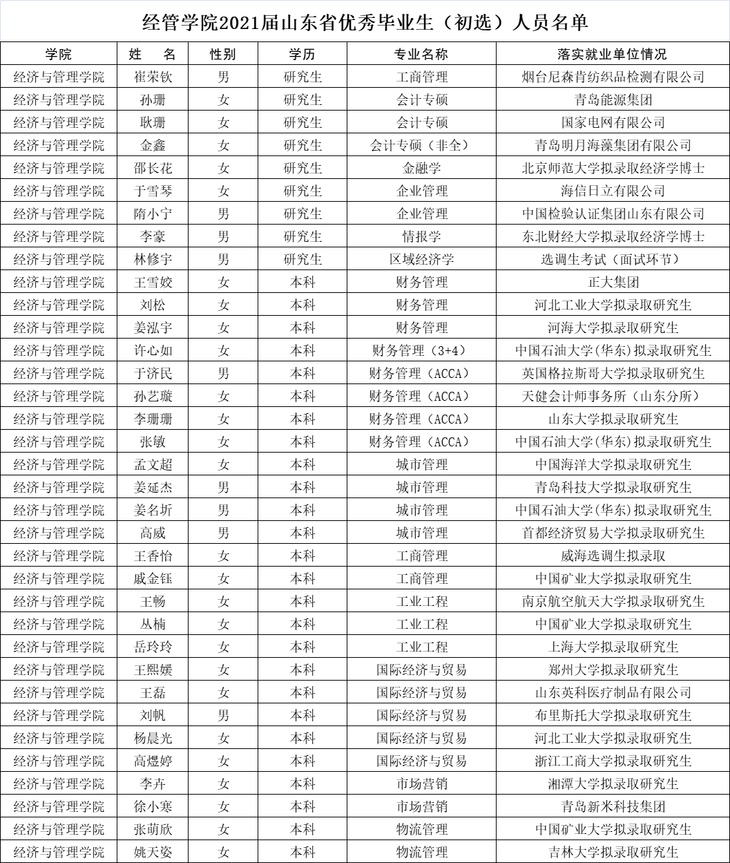 2021届山东省优秀毕业生(初选)人员名单(见下表),予以公示,公示时间:2021年4月28日-30日。