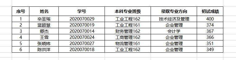 自设)评选办法,我院工业工程162班辛圣瑶等6名同学获得研究生新生奖学金,奖励人民币6000元,名单公示如下: