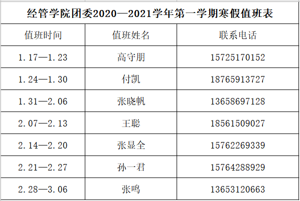 韦德国际 团委2020—2021学年第一学期寒假值班表