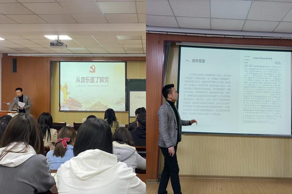 “音乐党课“忆激情岁月:高守朋老师以一首《没有共产党就没有新中国》带领全体党员翻开风云激荡的红色篇章。通过讲述歌曲的创作背景,让同学们回到抗战年代,重温峥嵘岁月;借以歌曲创作者曹火星的经历,让大家体会到青年才子愿做星火、誓在革命队伍中发光发热的决心;带领全体党员齐声高唱《共产党就没有新中国》,表达浓浓的爱党爱国之情。