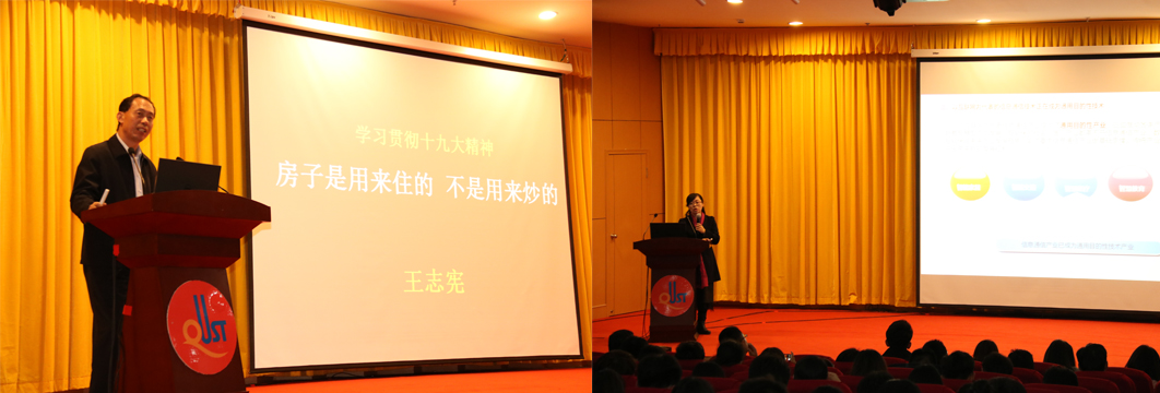 报告会上,王志宪作了题为《学习贯彻十九大精神之房子是用来住的不是用来炒的》的报告,介绍了三次党代会对房子的表述、房价问题和影响房价的因素,并对我国未来房价进行展望,以社会关注的房子问题为切入点,使十九大精神深入人心。董华在《十九大报告之建设现代化经济体系的解读》报告中,运用大量案例对十九大报告中提出的“推动互联网、大数据、人工智能和实体经济深度融合”进行解读与剖析,提高了师生们对互联网经济的认知。孙在东作题为《十九大报告的新思想,新论断,新提法,新举措》的报告,对新时代“举什么旗”,“走什么路”,“应有什么样的精神状态”等问题着重展开论述,引领广大师生深入学习贯彻十九大报告中体现的“四个新”。郭慧志则从十八大与十九大军事方面的差异入手,带来《党的十九大与新时代军事变革》的报告,突出习总书记在十九大上提出的“坚持走中国特色强军之路,全面推进国防和军队现代化”的论述,为师生分析了十九大军事改革的主要特点与难点,讲解了十八大以来的军队与国防改革问题。