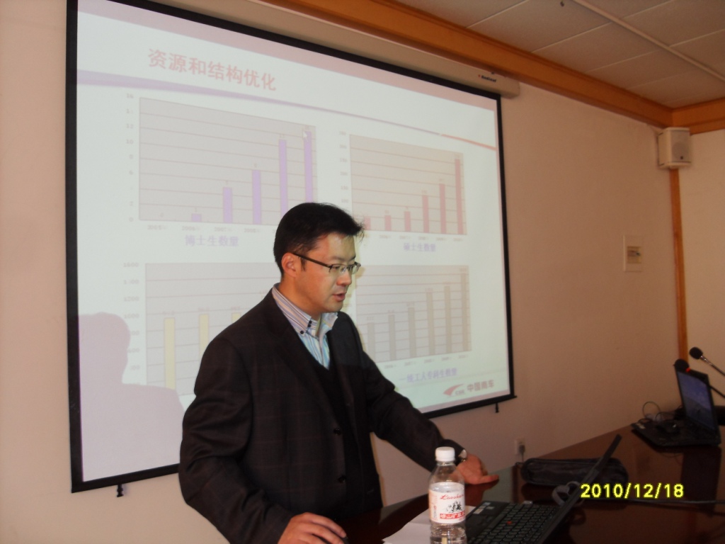 2010年12月18日上午,南车四方机车公司董事会秘书,企管部部长兰玉贞先生为青岛科技大学MBA学员带来一场别开生面的人力资源课程,题为:战略人力资源管理支撑“和谐号”动车组驶向高速。