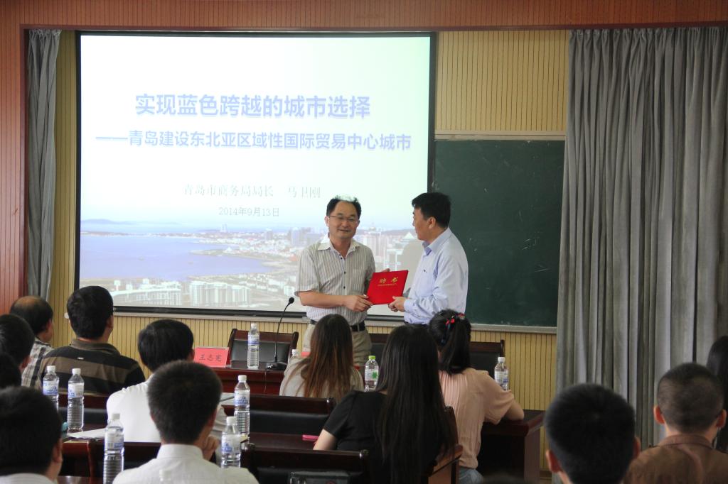 马卫刚局长的讲座紧紧围绕“建设青岛成为东北亚区域性国际贸易中心城市”的主题,以“青岛商贸发展的历史”为引线,从唐宋时期的板桥镇、新中国成立后的外贸港口城市、改革开放时期沿海开放城市、全球化时代东北亚国际贸易城市等多个方面进行了讲述。针对青岛市政府出台的《青岛市国际贸易中心城市建设纲要(2013--2020)》进行了解读,指出以加快建设国际贸易中心城市为契机,打造青岛蓝色经济科学发展升级版,着力打造“六大中心”,到2020年青岛基本建成东北亚区域性国际贸易中心城市,全市电子商务交易突破1万亿元,全市国际货物贸易总值达到1500亿美元,青岛口岸贸易额3000亿美元等。