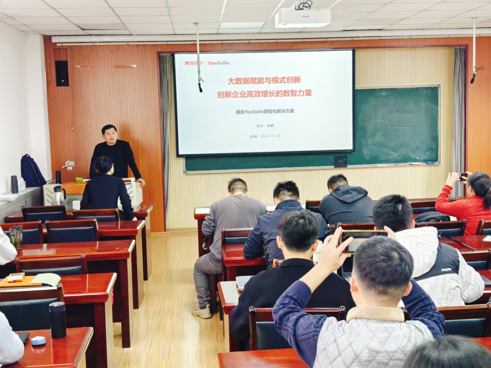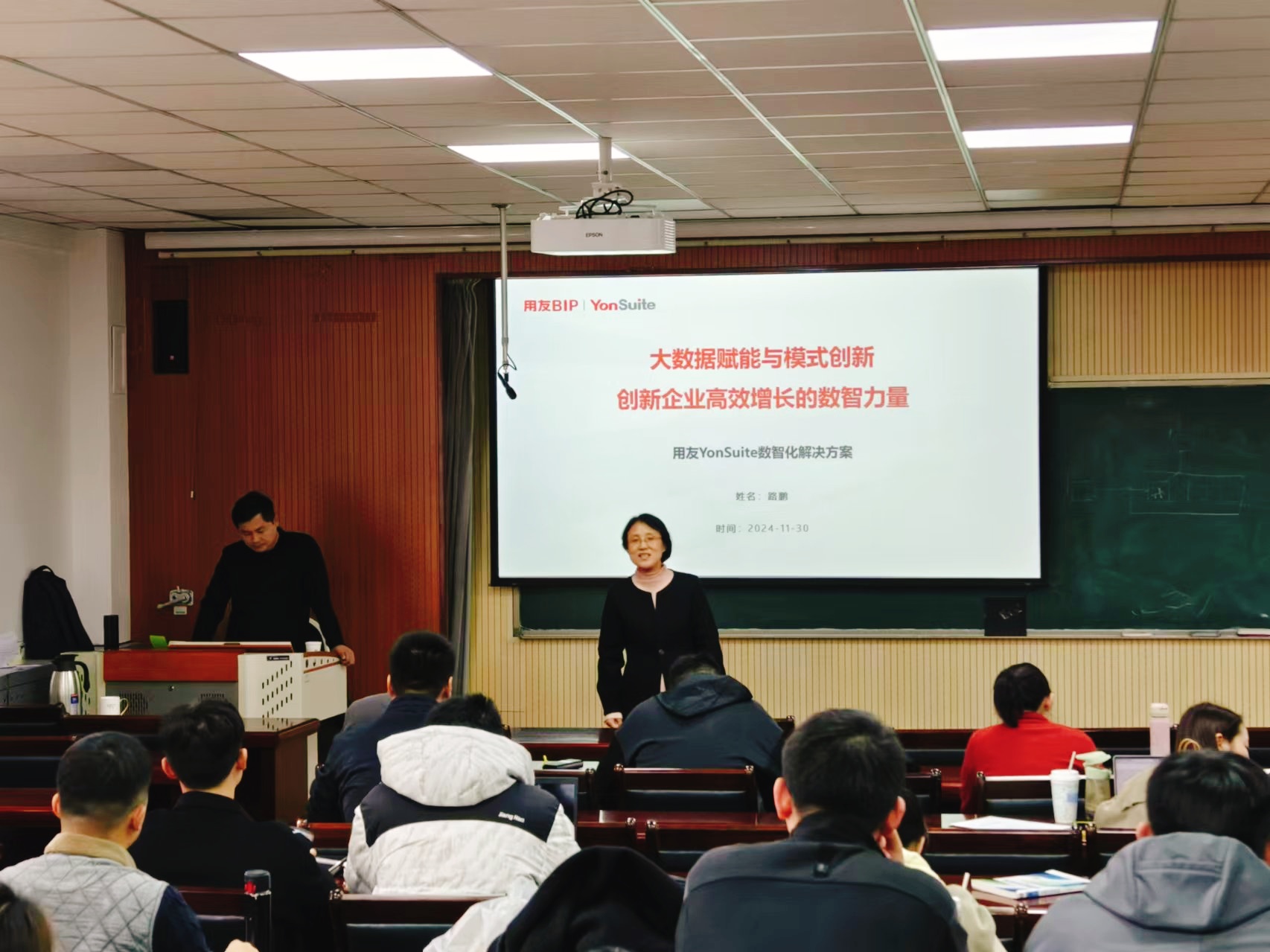 课上,路总回忆了在青科大求学的时光和个人从业经历, 之后围绕“创新企业高效增长的数智力量—用友YonSuite数智化解决方案”,介绍了用友领航企业服务36年来,在数智化转型道路上的探索与成就,详细阐述了财务云、人力云等十大业务场景基于用友BIP数智创新平台进行协同工作,形成一站式全场景数智化解决方案,助力企业实现从业务数字化到数据业务化的跨越。特别是YonSuite产品的介绍,让学员们深刻感受到了大数据与人工智能技术如何赋能企业,实现营销、采购、费控等环节的智能化管理,构建高效的研产销一体化服务平台,从而显著提升企业的运营效率和竞争力。