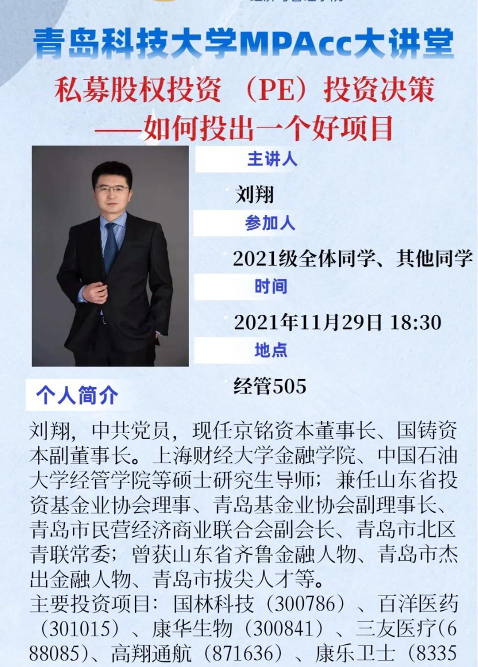 硕士研究生导师,我院校外导师刘翔老师给我们带来了一场精彩的大讲堂。本次的主题是建立在刘翔老师投资经历的基础上的“私募股权投资(PE)—如何投出一个好项目”。讲座由MPAcc中心主任于培友老师主持,我院2021级会计专硕研究生参加了本次讲座。讲座围绕了如何投资、未来热门的投资项目等方面展开。